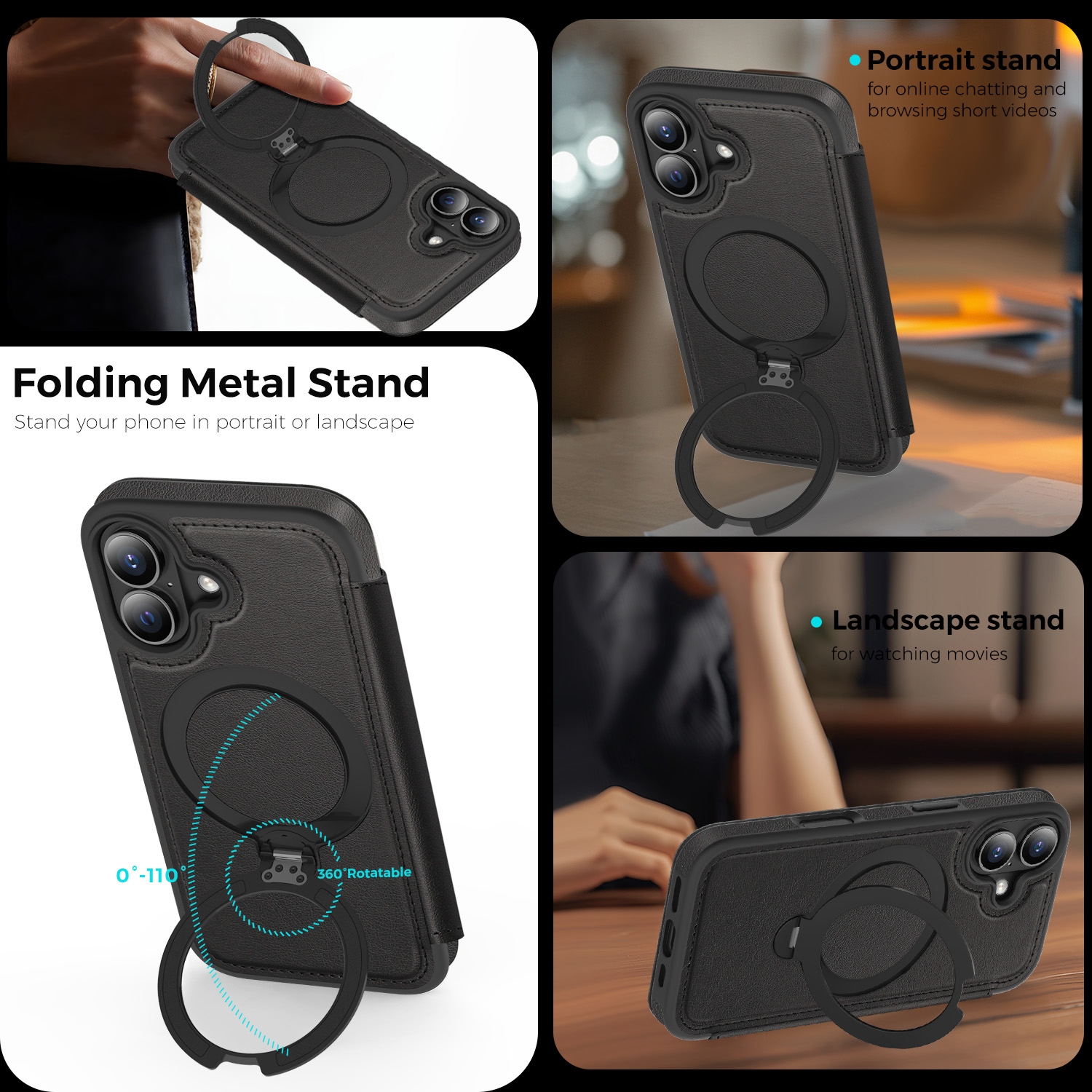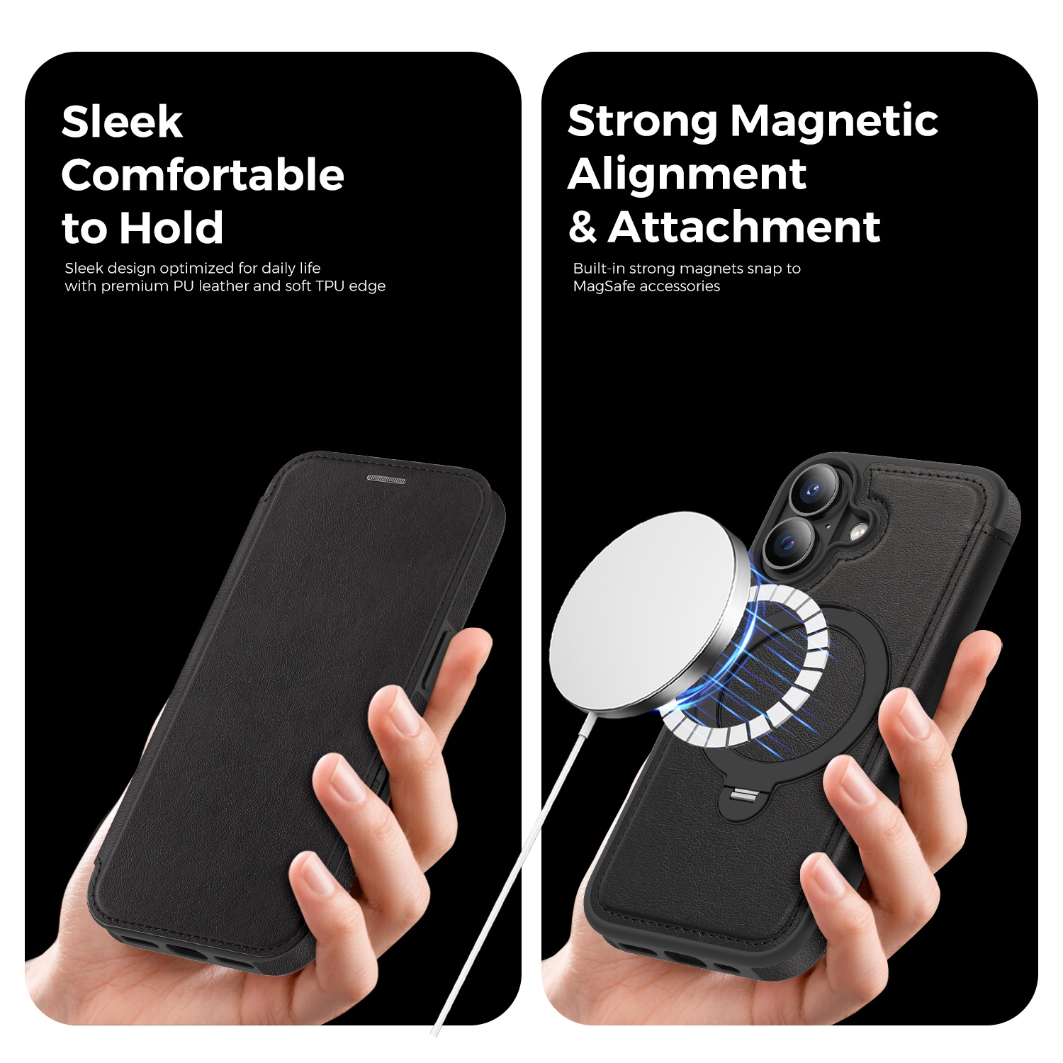360° Rotating Stand iPhone 17 Case - Magnetic Wireless Charging PU Cover, Black