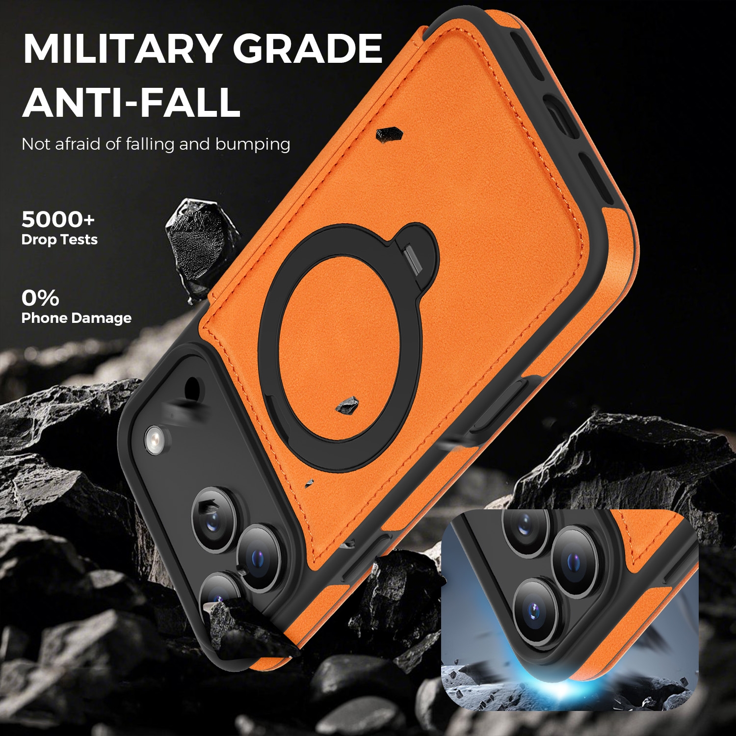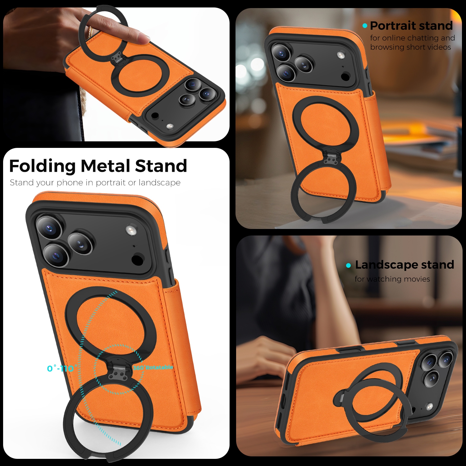 360° Rotating Stand iPhone 17 Pro Max Case - Magnetic Wireless Charging PU Cover, Orange