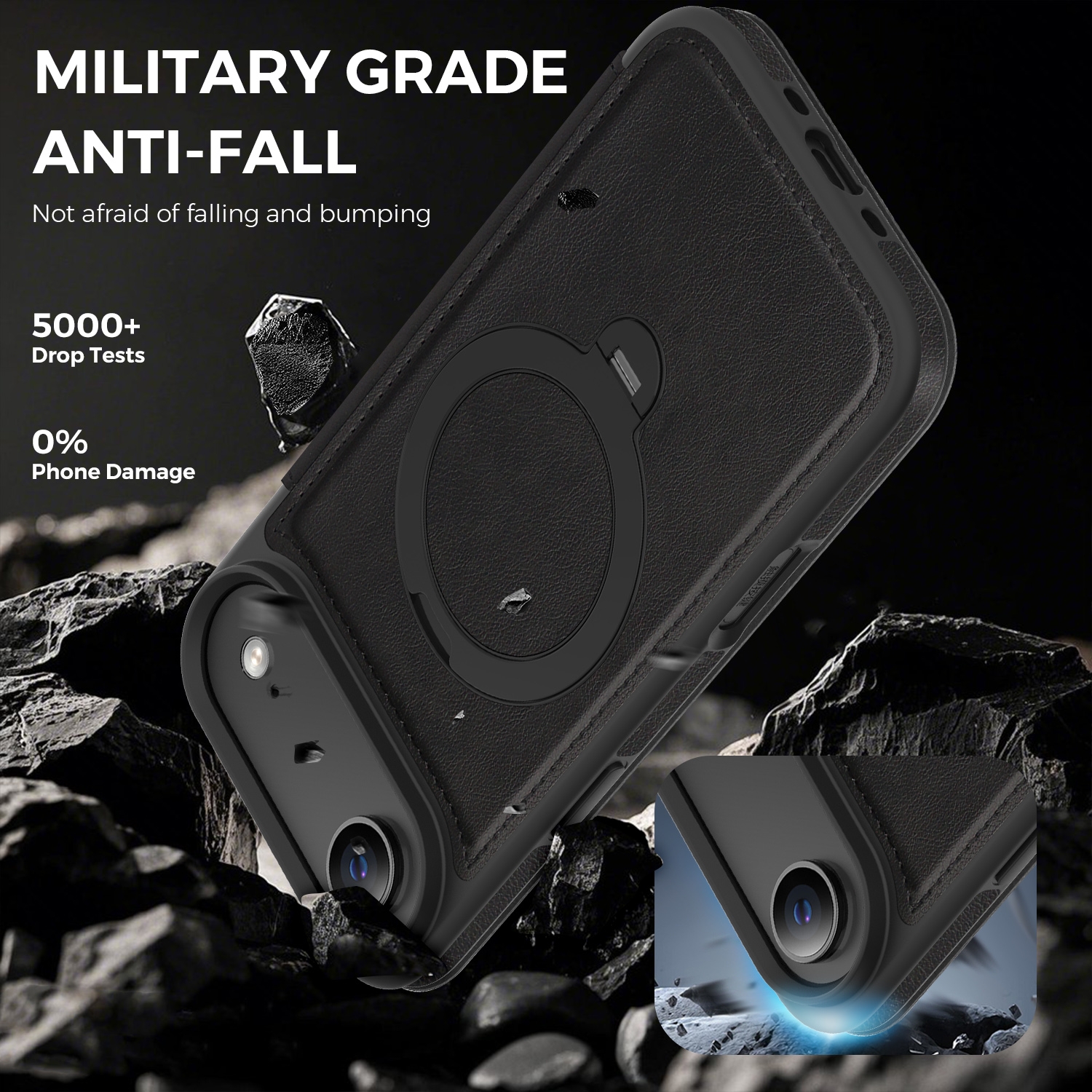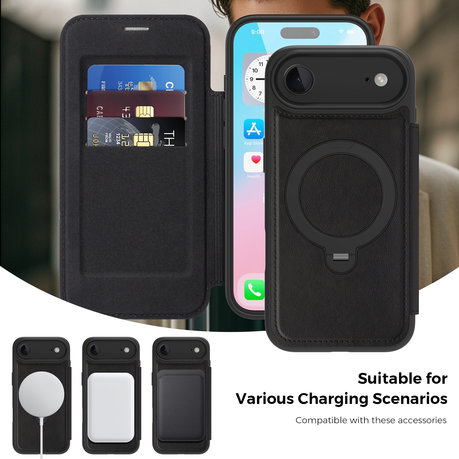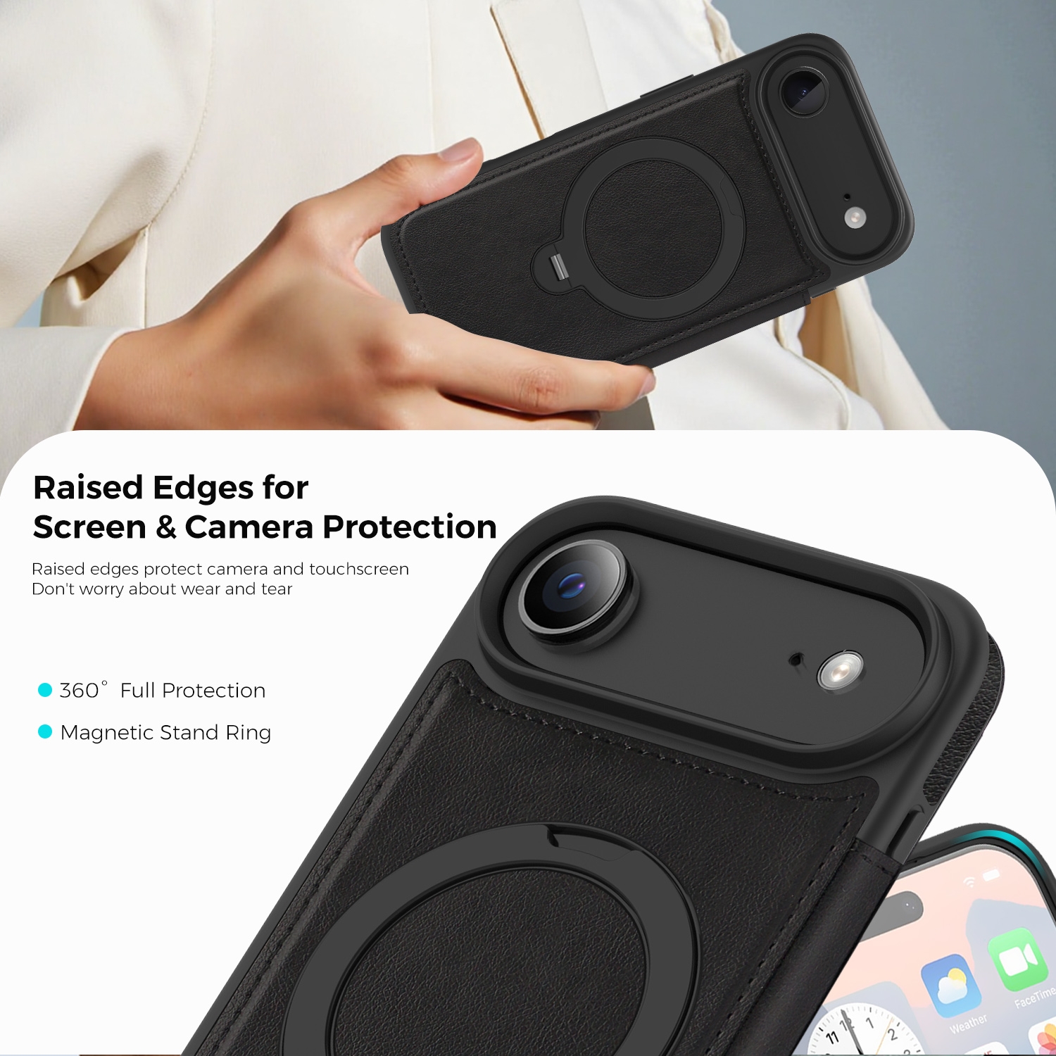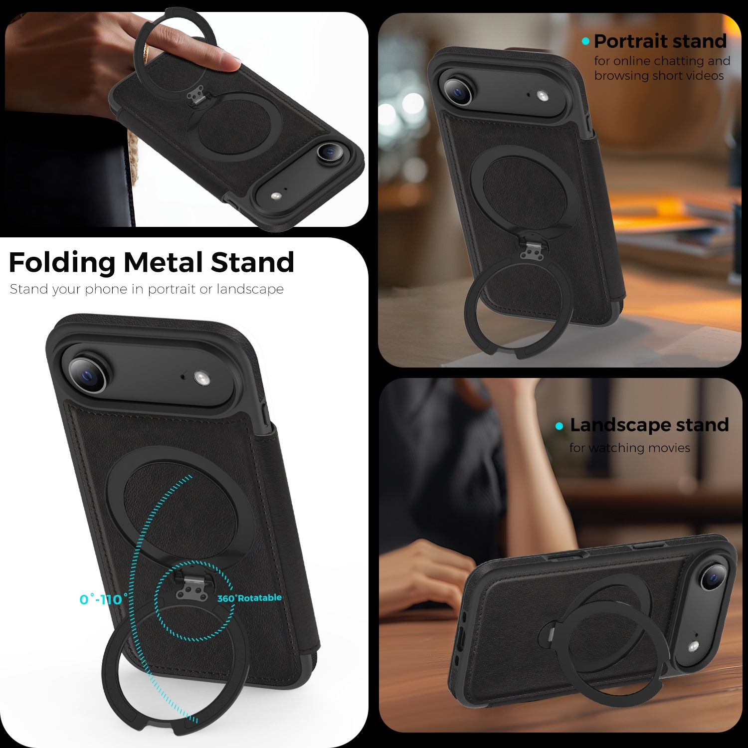 360° Rotating Stand iPhone Air Case - Magnetic Wireless Charging PU Cover, Black