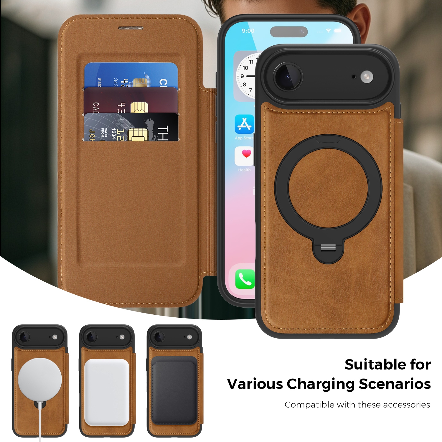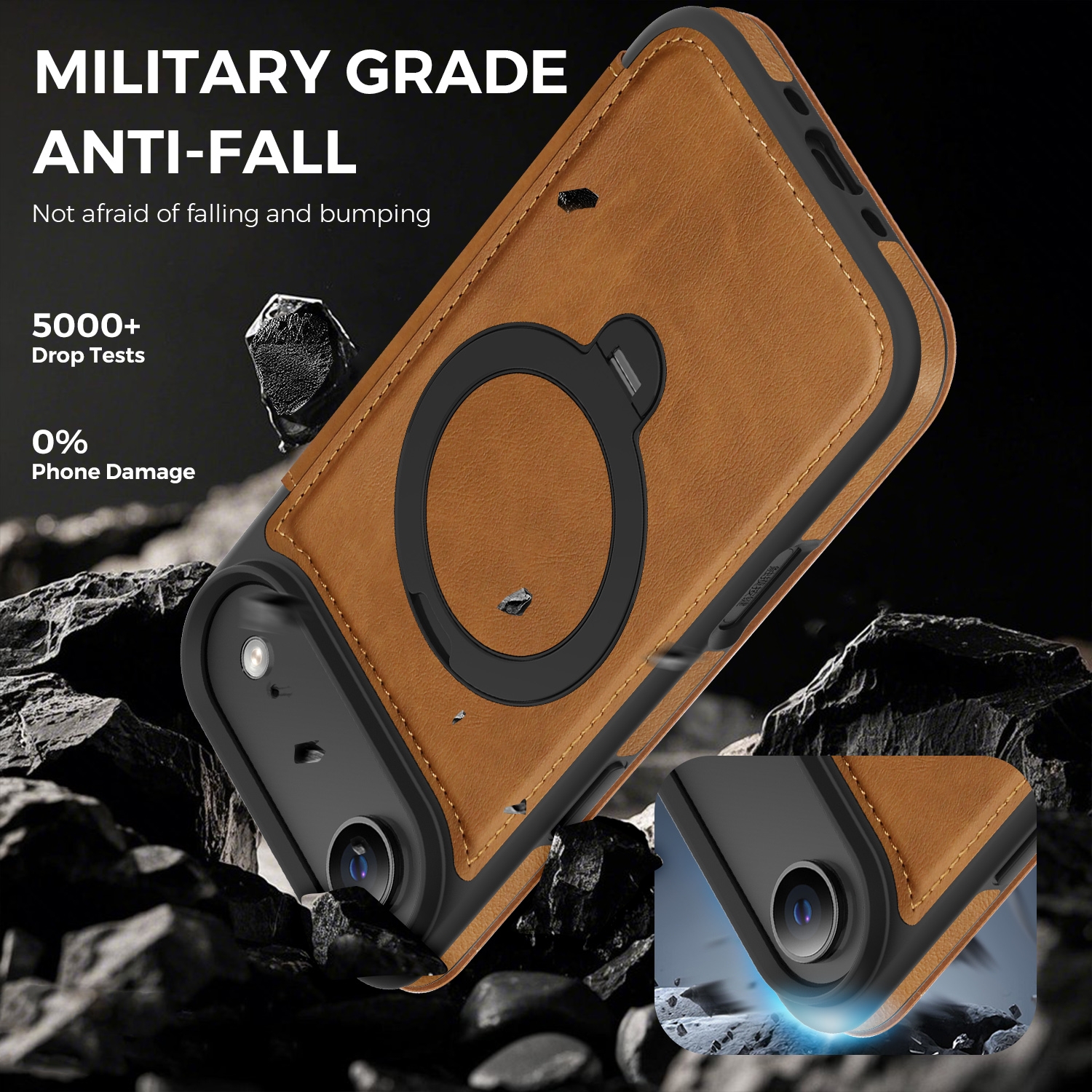 360° Rotating Stand iPhone Air Case - Magnetic Wireless Charging PU Cover, Brown