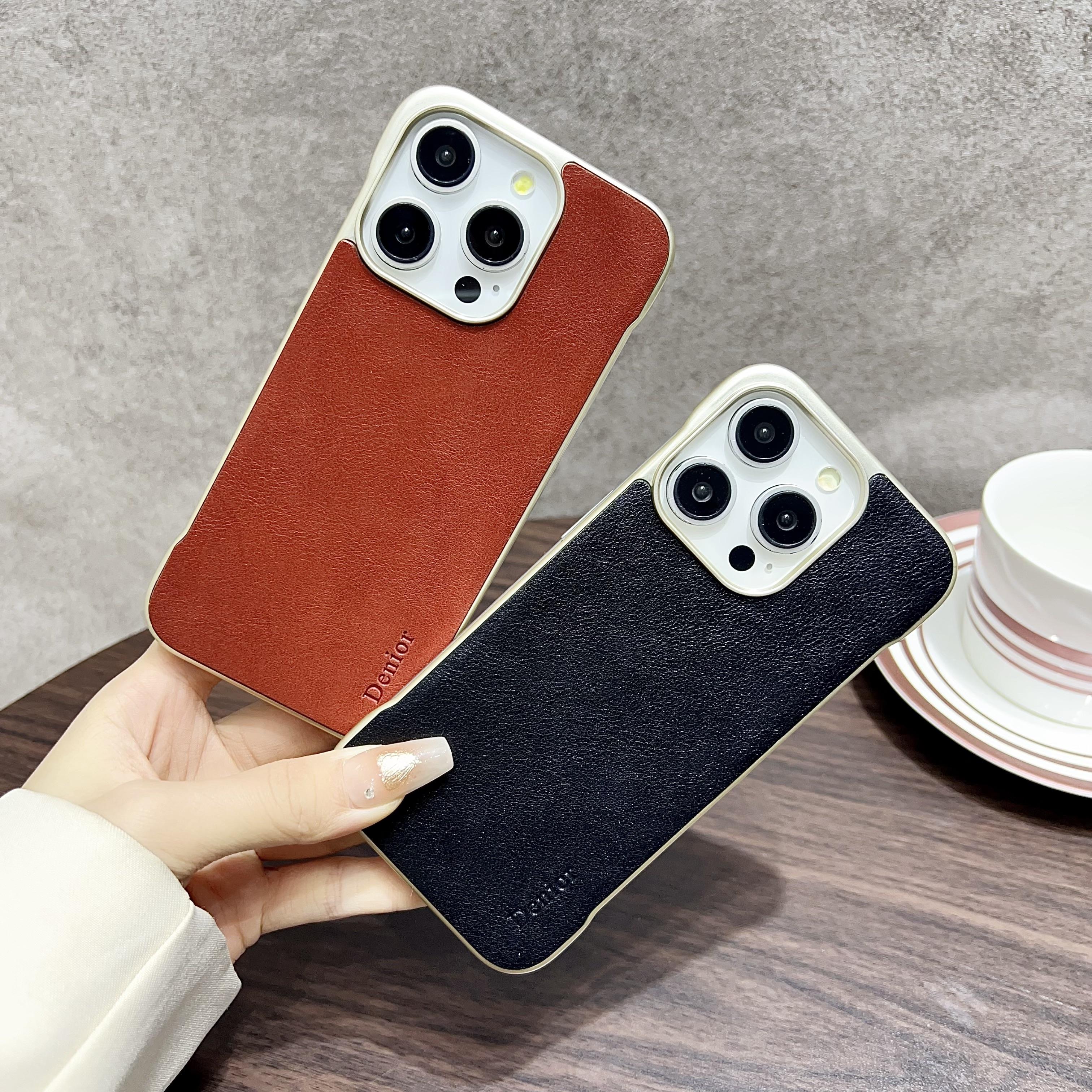 Denior Calf Pattern Genuine Cowhide Leather Frameless Phone Case for iPhone 16 Pro | Built-in N52 Magnet & MagSafe Wireless Charging Compatible | Genuine Cowhide Leather | Light Gold Painted Case - Black