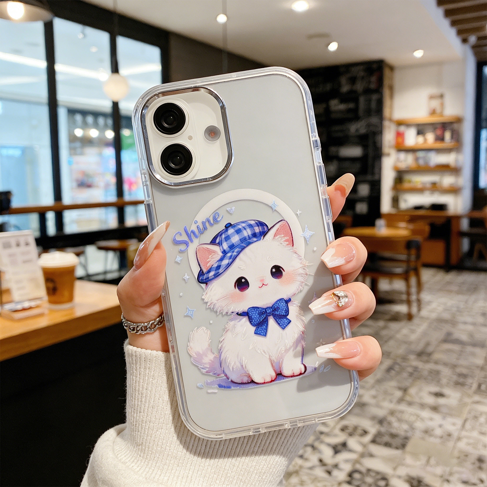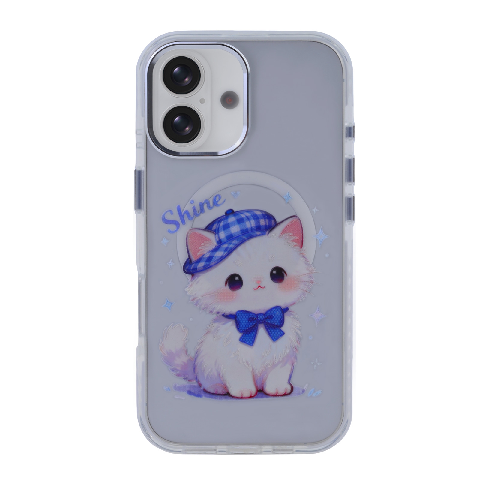 Clear Magnetic Phone Case for iPhone 17 - Cute White Cat with Blue Plaid Hat Design