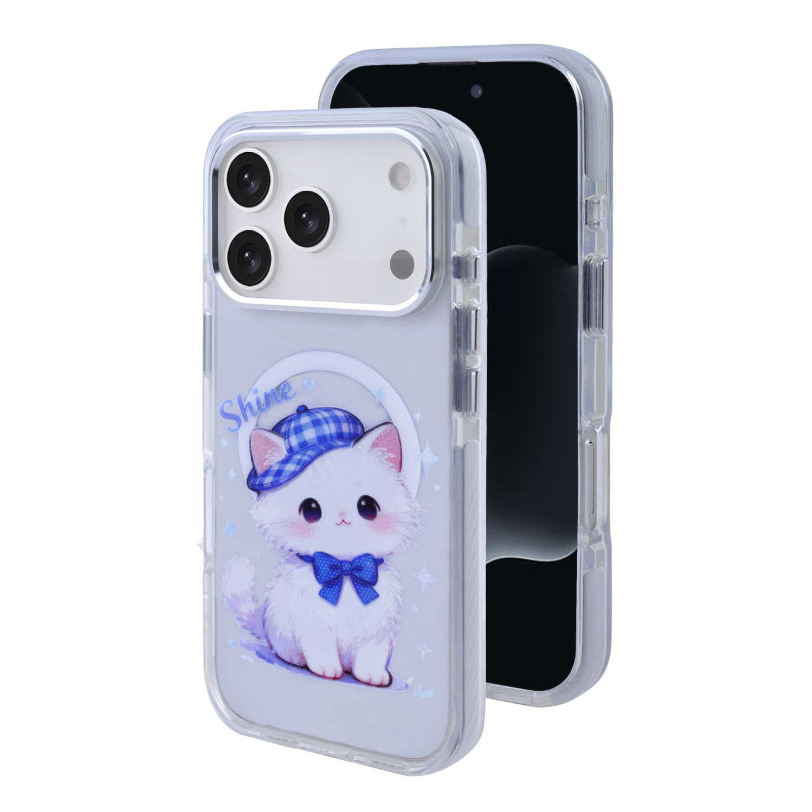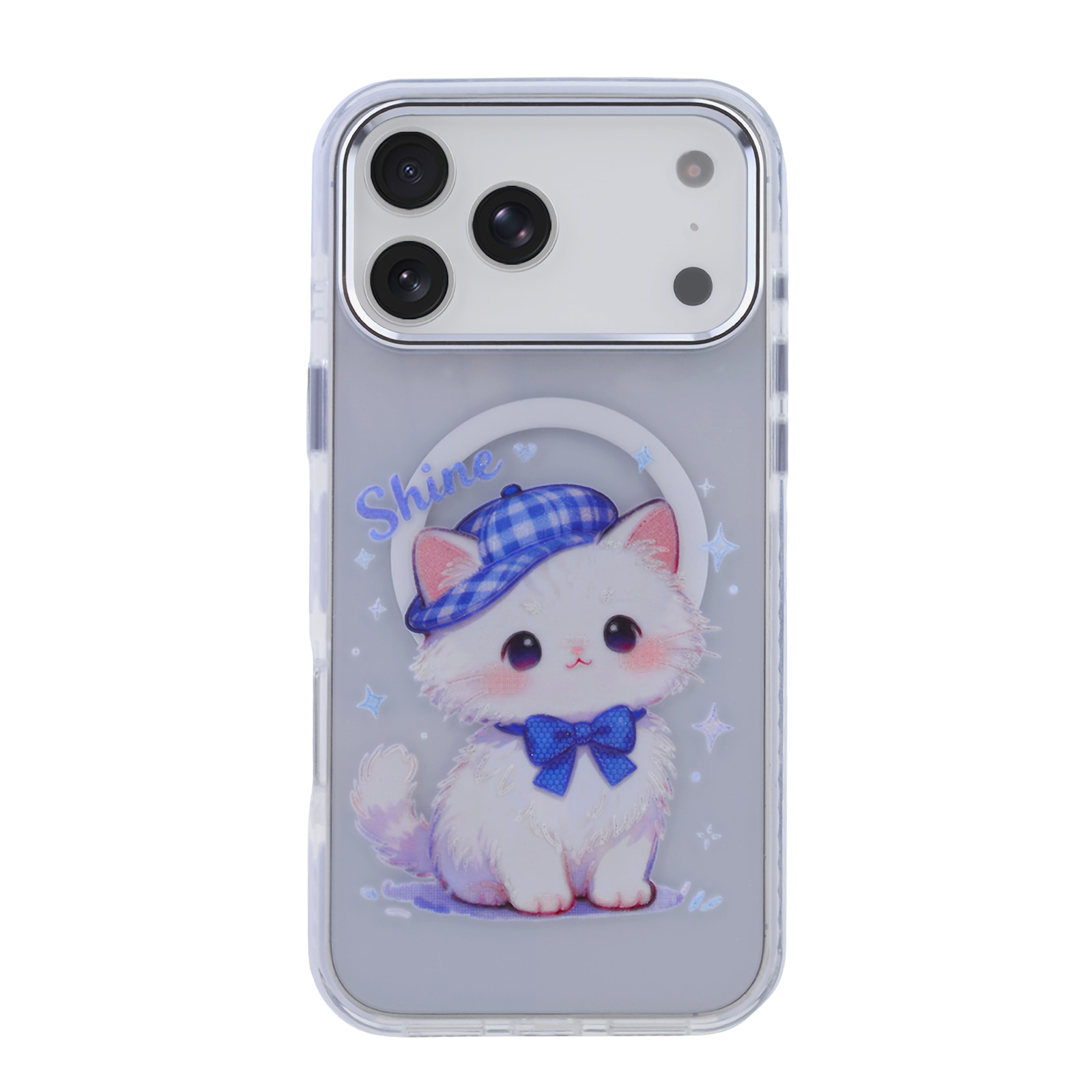 Clear Magnetic Phone Case for iPhone 17 Pro - Cute White Cat with Blue Plaid Hat Design