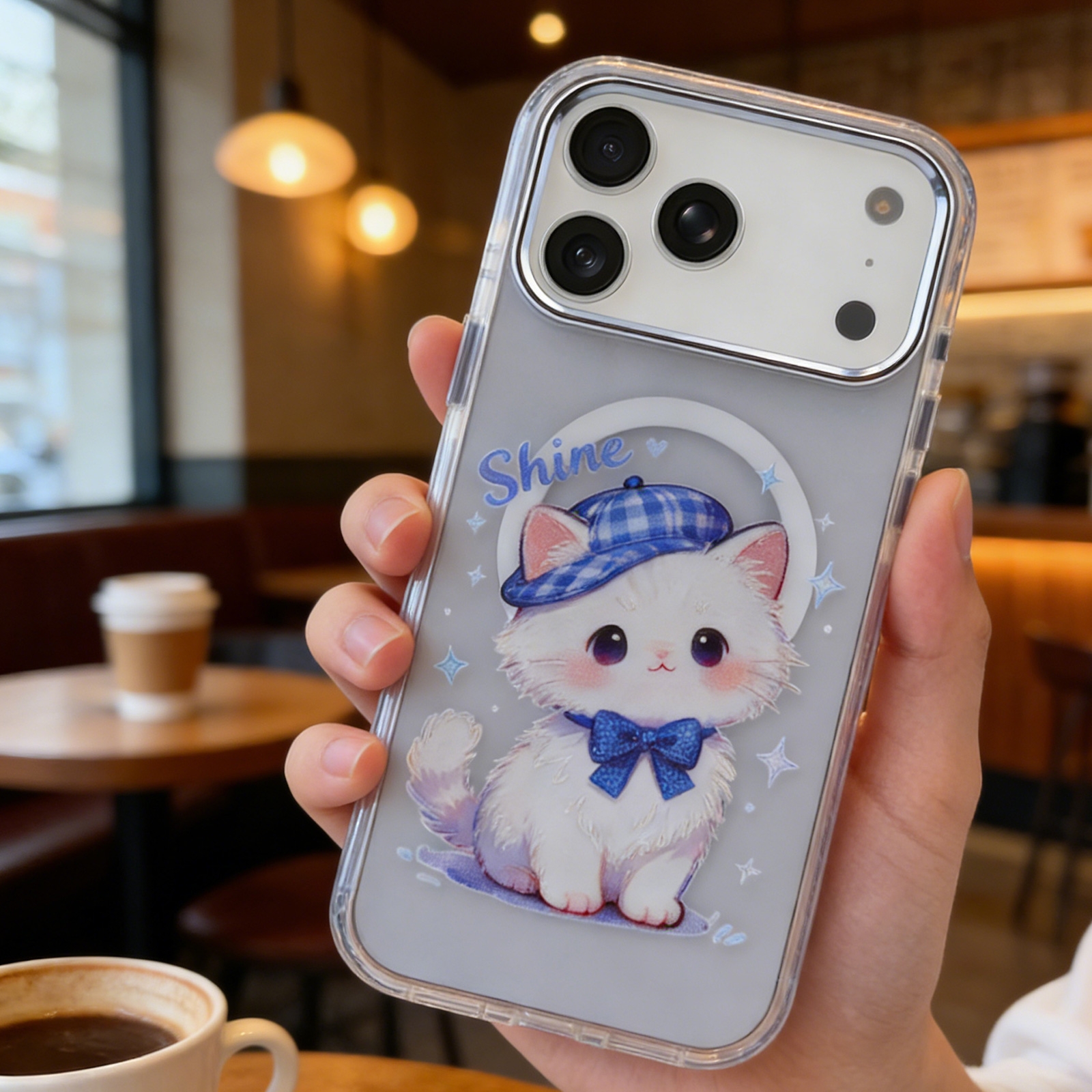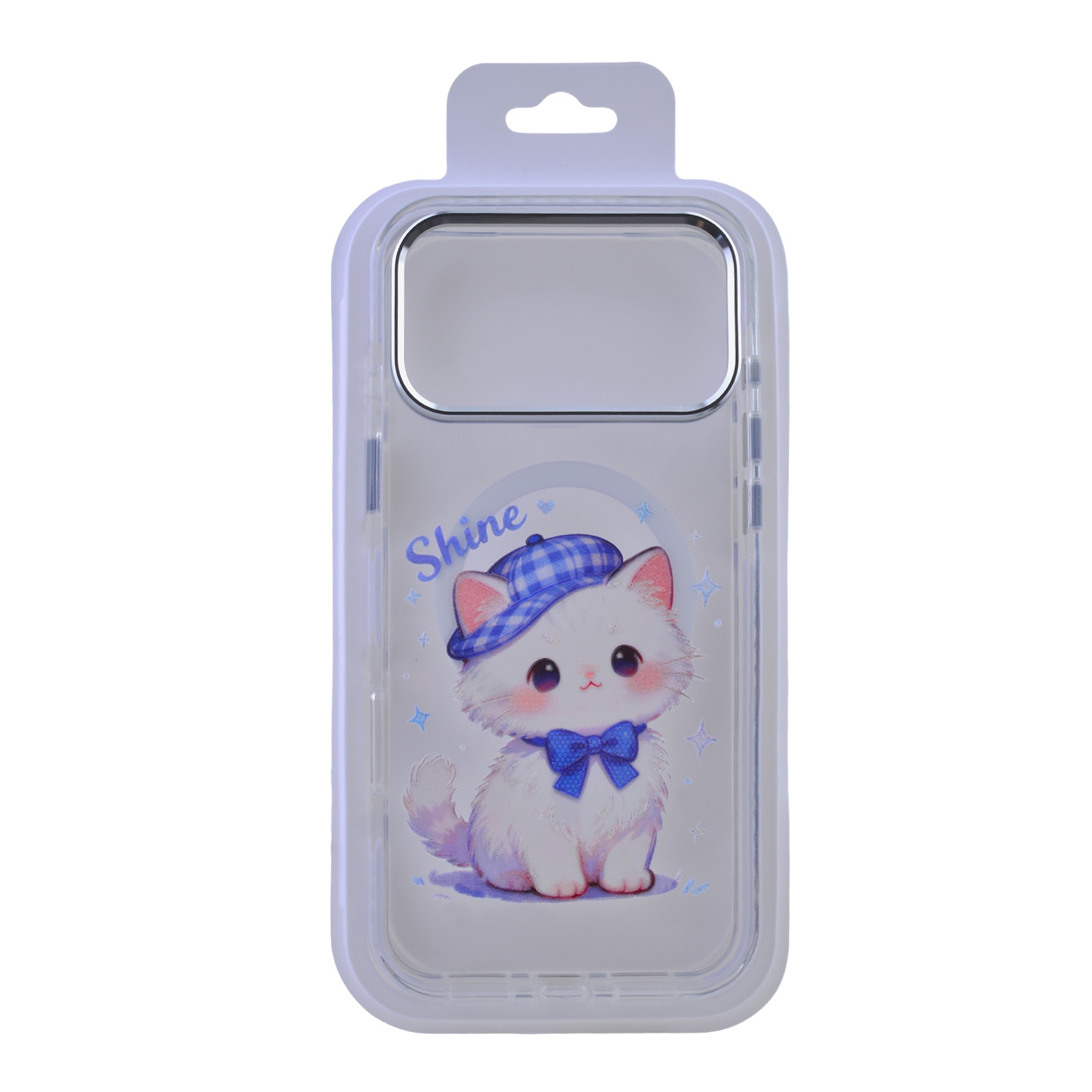Clear Magnetic Phone Case for iPhone 17 Pro Max - Cute White Cat with Blue Plaid Hat Design