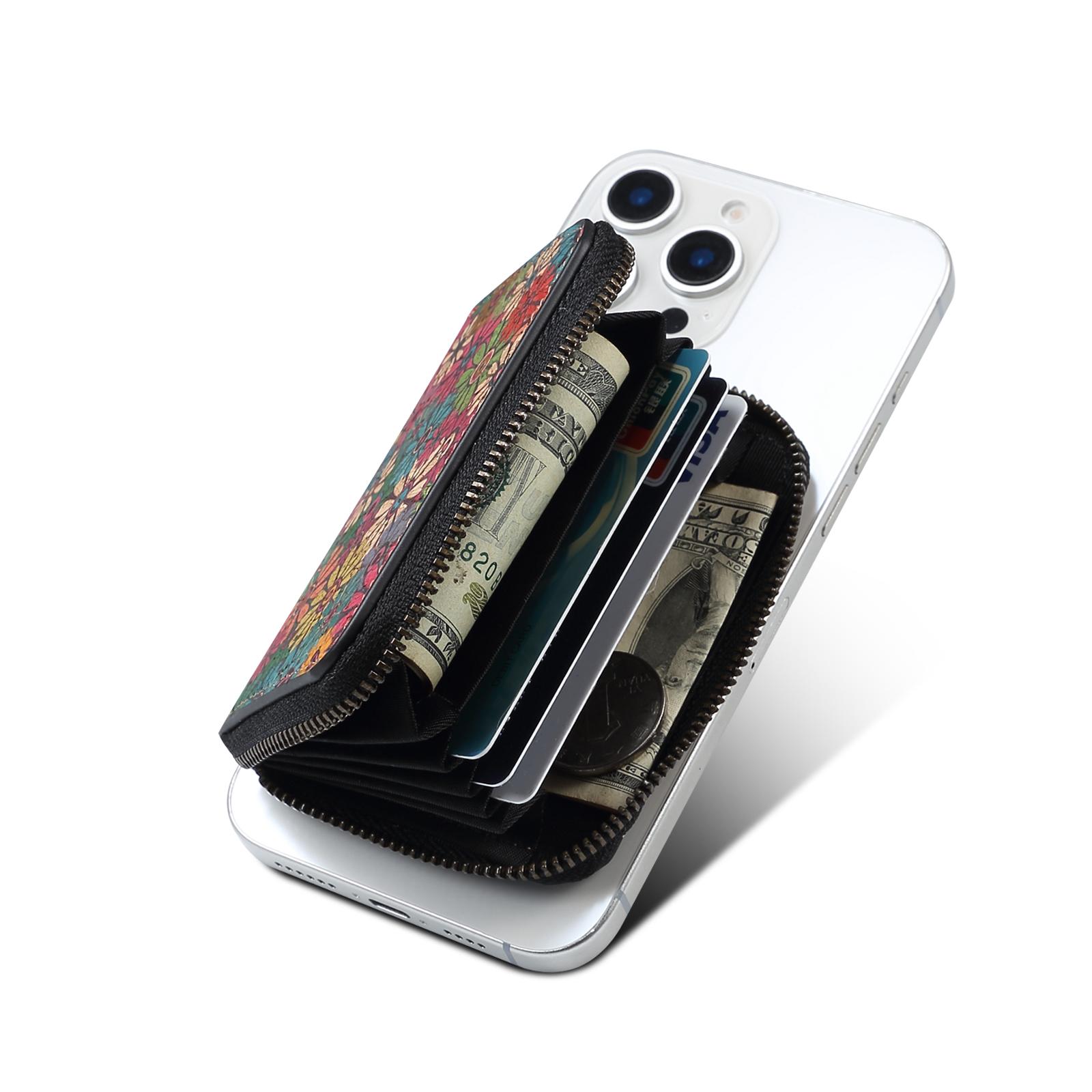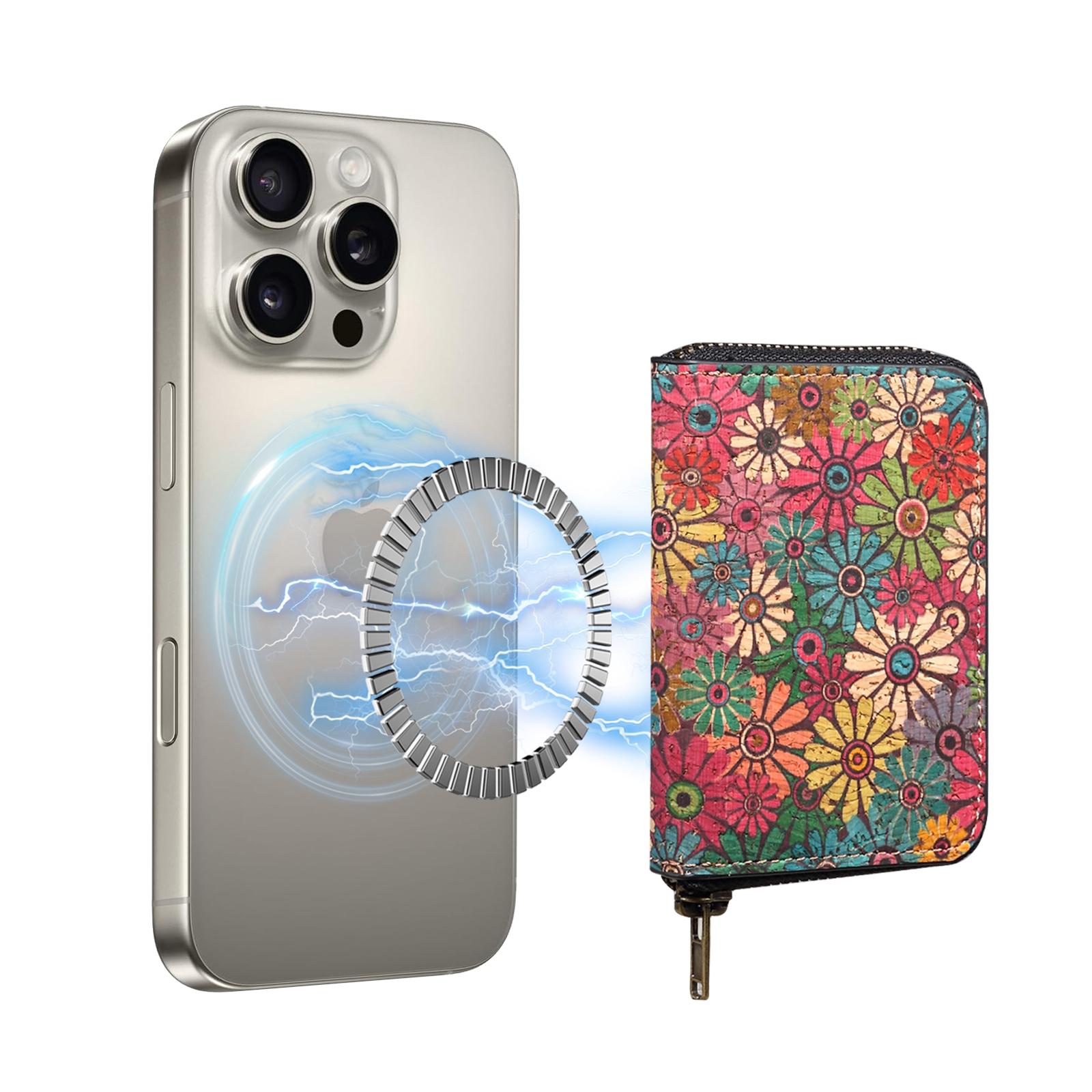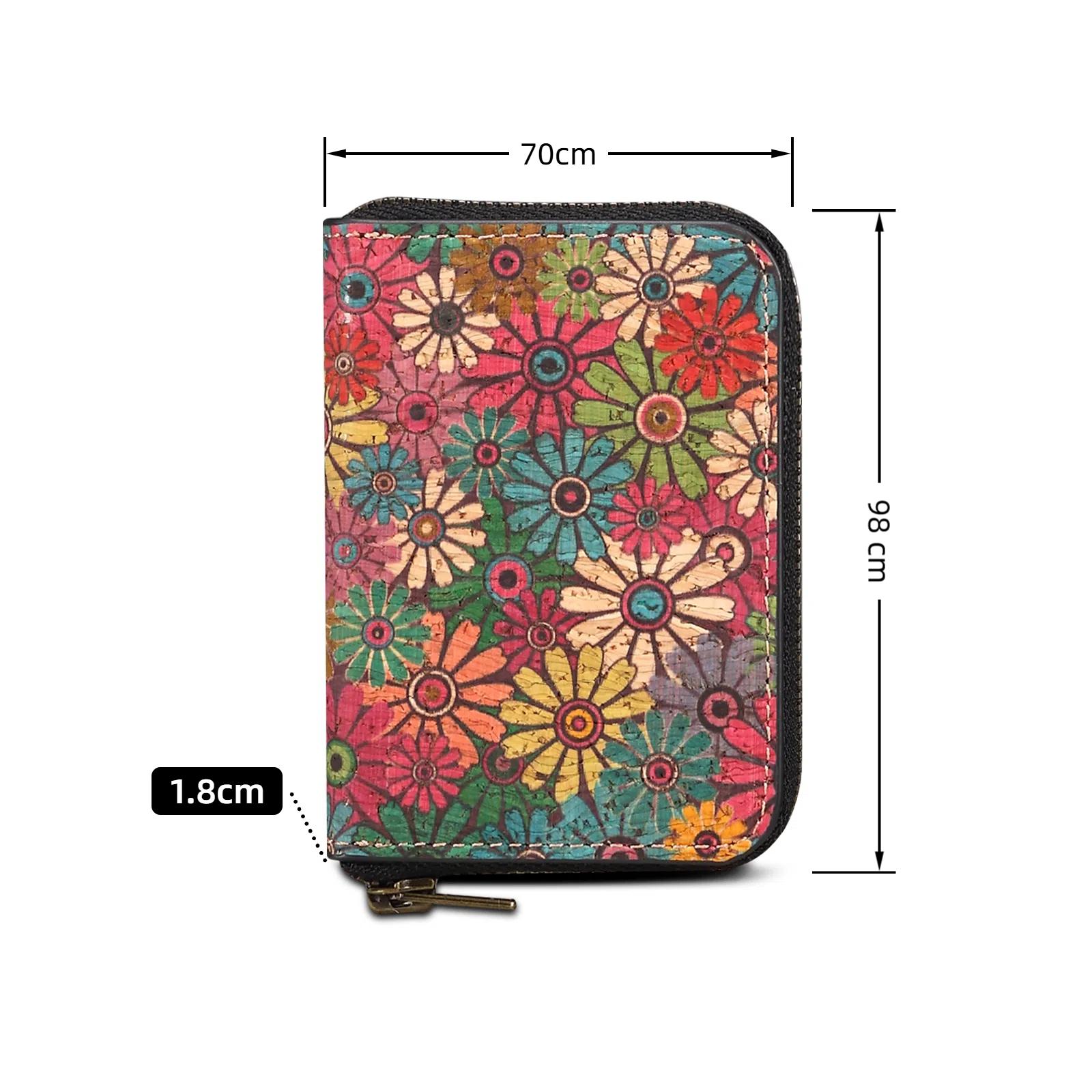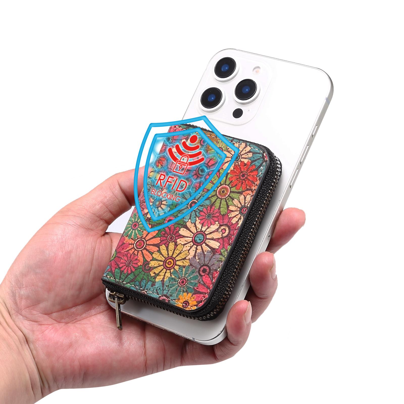 Cork Floral Printed N52 Magnetic RFID Blocking Zipper Card Holder, Green