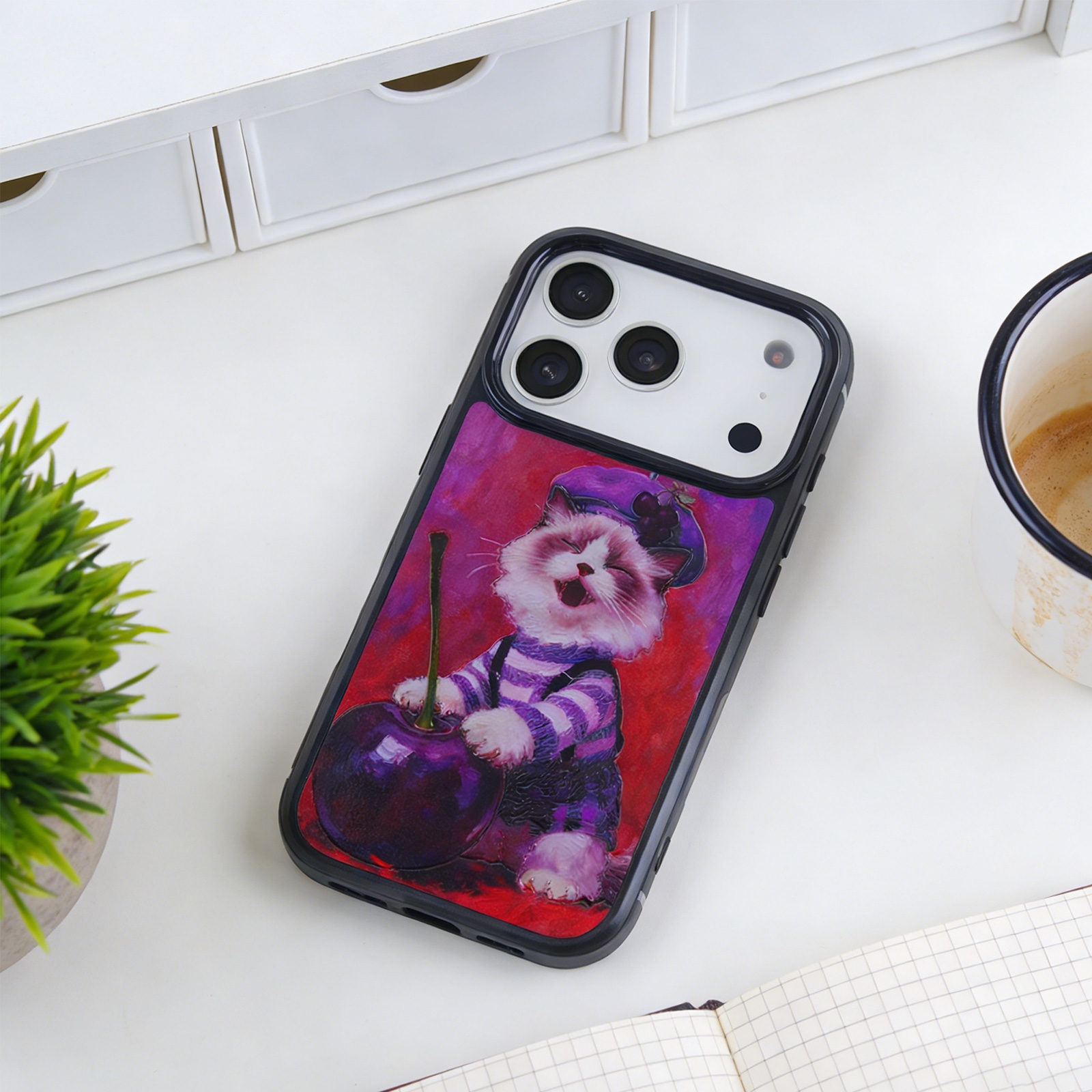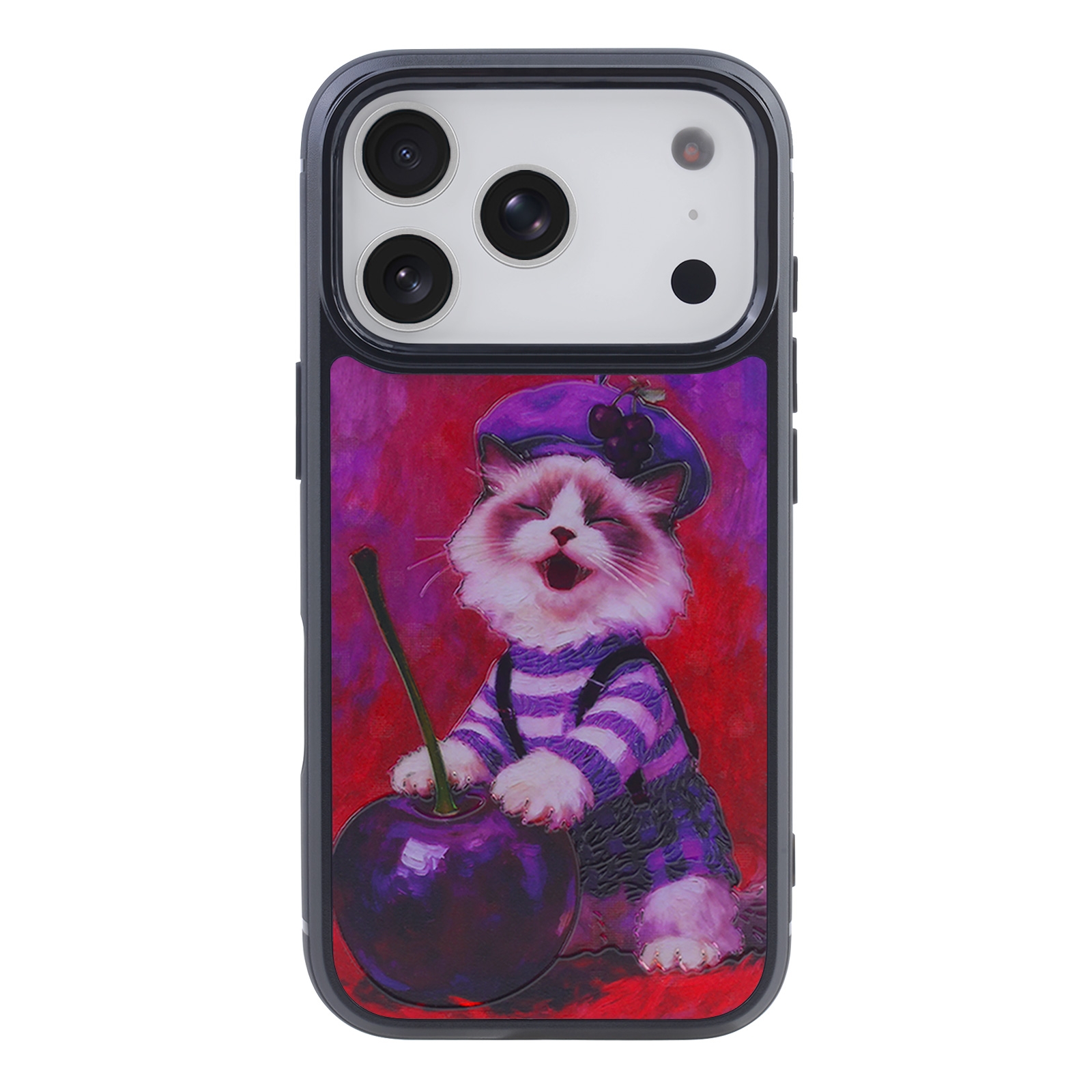Cute Cherry Cat Phone Case for iPhone 17 Pro - Vintage Oil Painting Art Print Design, Purple