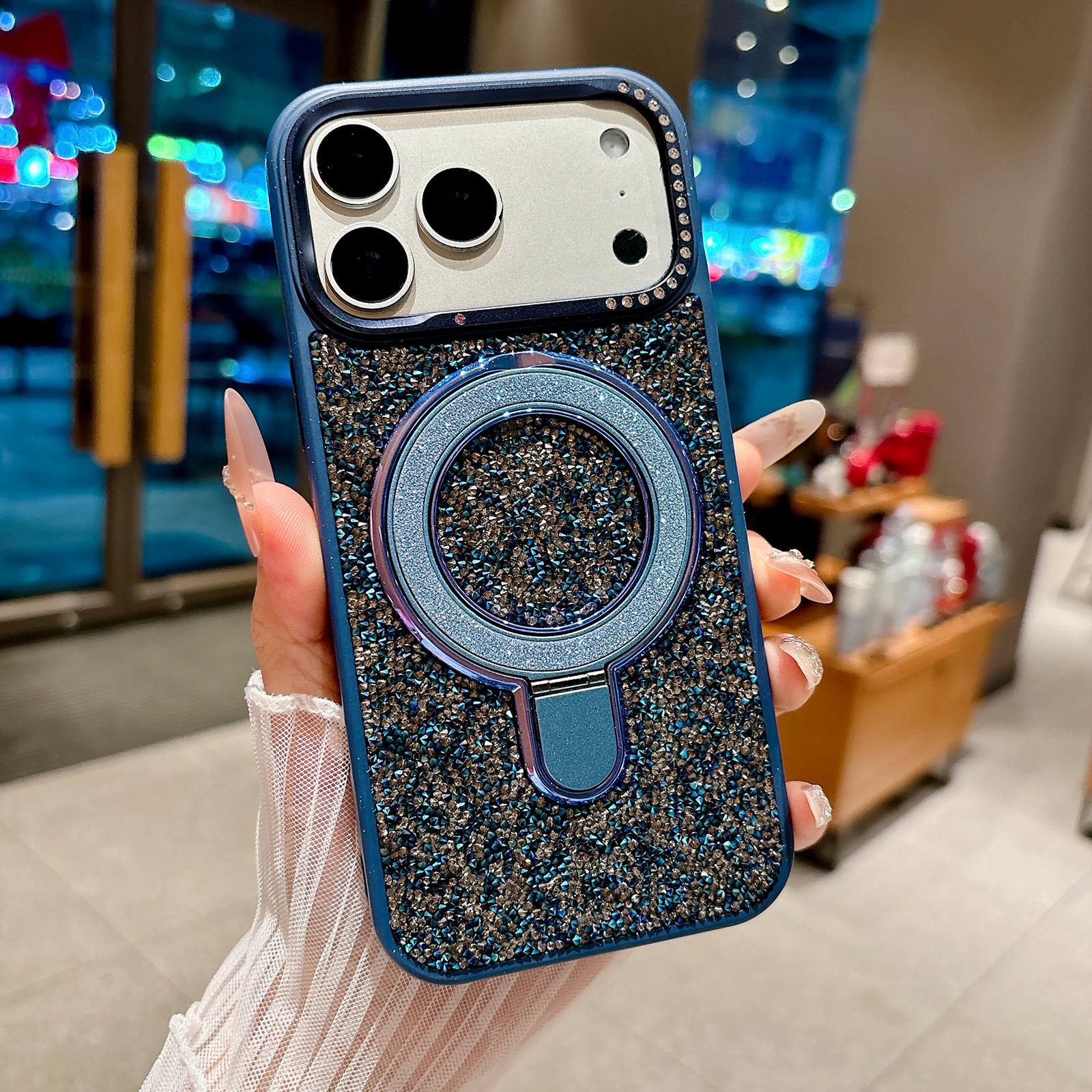 Glitter Magnetic Stand Phone Case for iPhone 17 Pro - Sparkly Rhinestone Design, Dark Blue