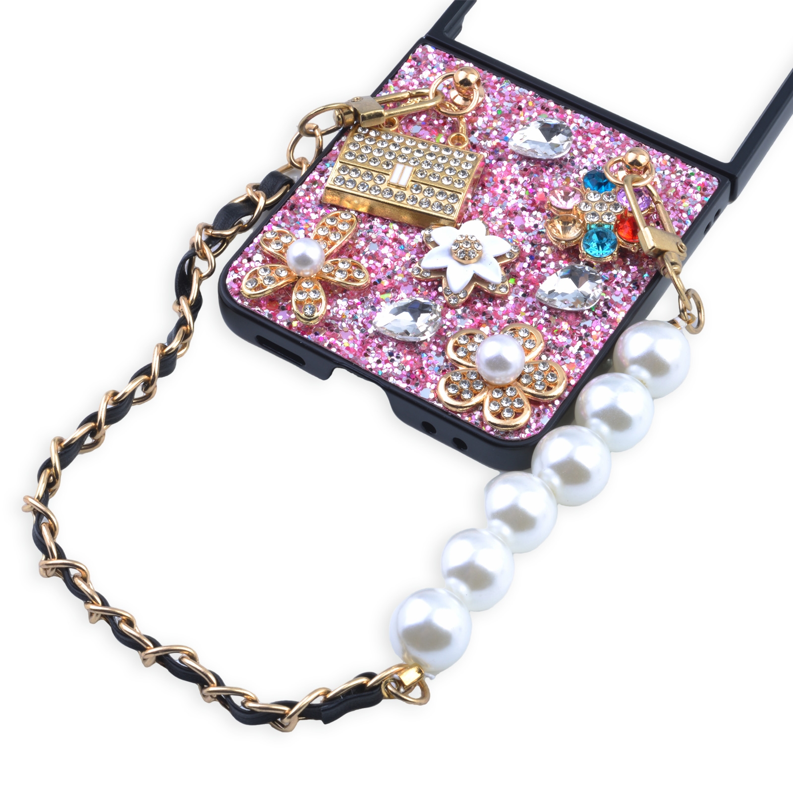 Glitter Rhinestone Case for Z Flip7 with Pearl Leather Chain Strap, Black