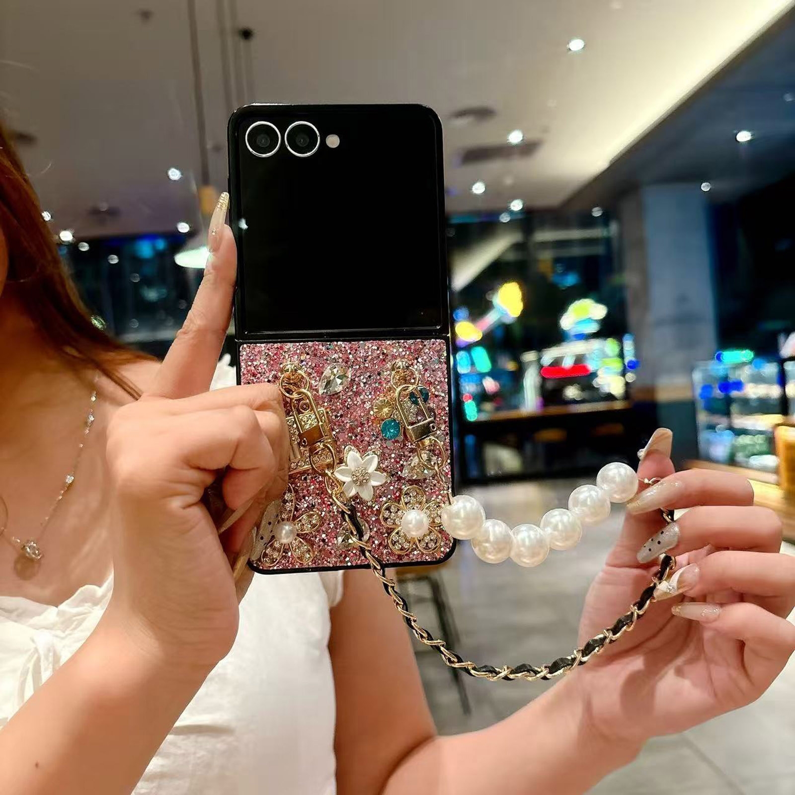 Glitter Rhinestone Case for Z Flip7 with Pearl Leather Chain Strap, Pink