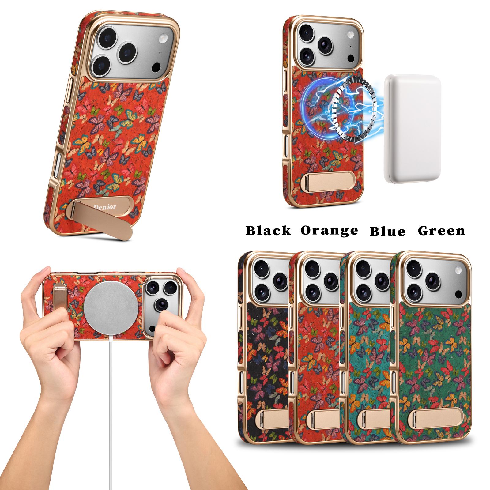 All pictures shown are for illustration purpose only. Actual product may vary due to product enhancement.Denior Butterfly Print Kickstand Phone Case for iPhone 17 Pro | Cork Material | Wireless Charging Supported - Butterfly Orange