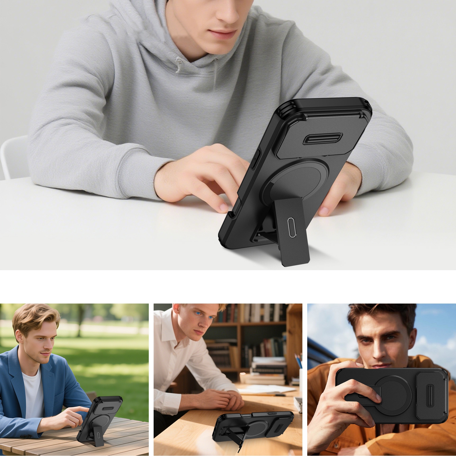 360 Rotation Kickstand Magnetic iPhone 17 Pro Case - Airbag Shockproof Metal Stand, Black