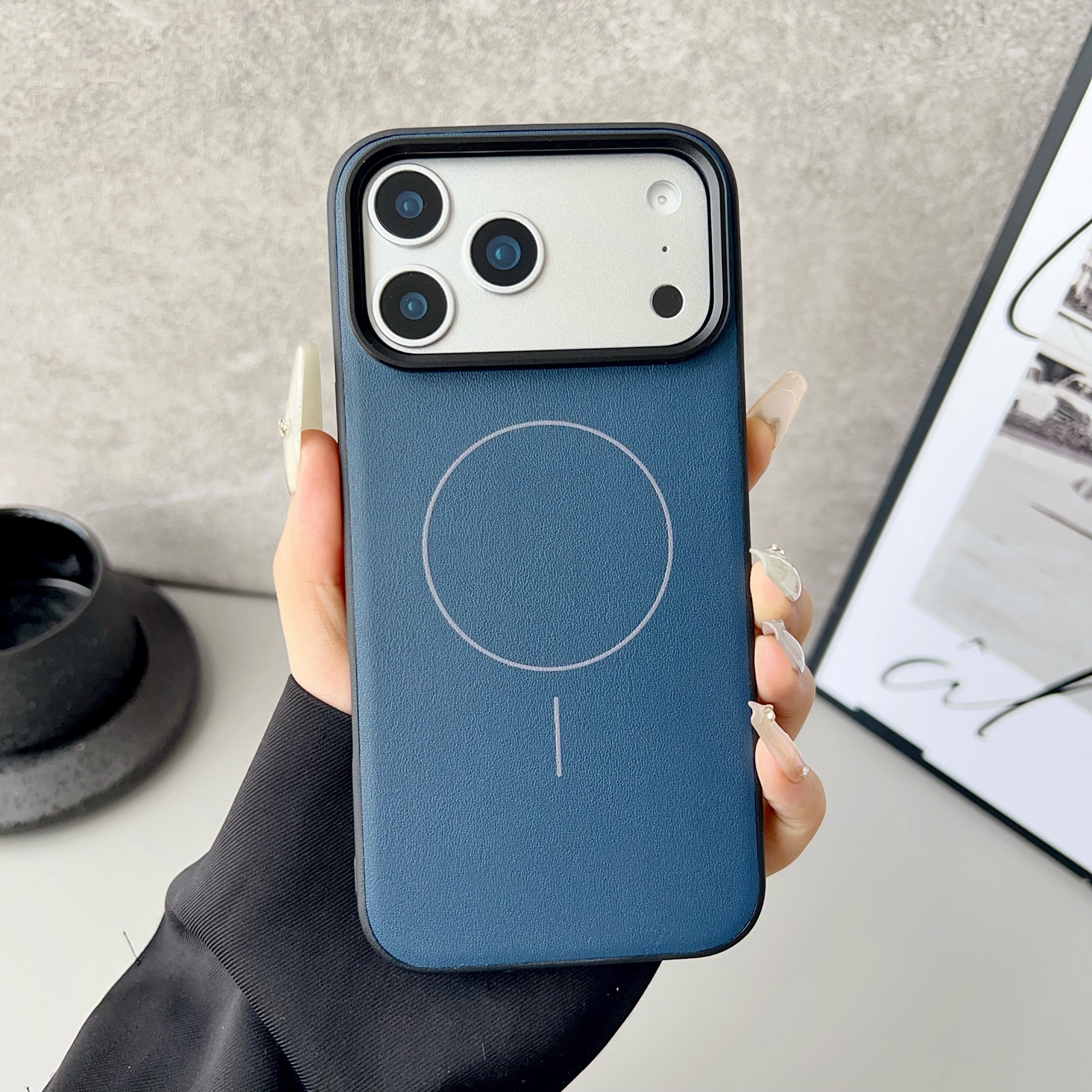 iPhone 17 Pro Leather-Wrapped Magnetic Case - Shockproof Hybrid Cover, Dark Blue