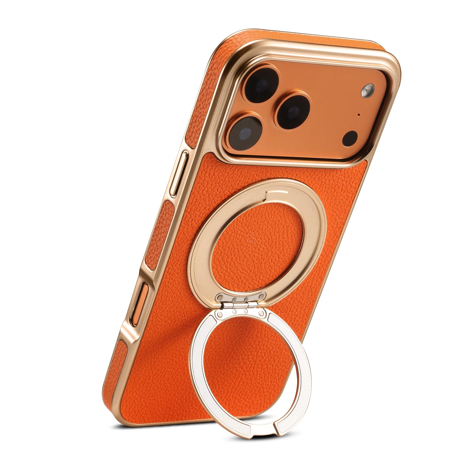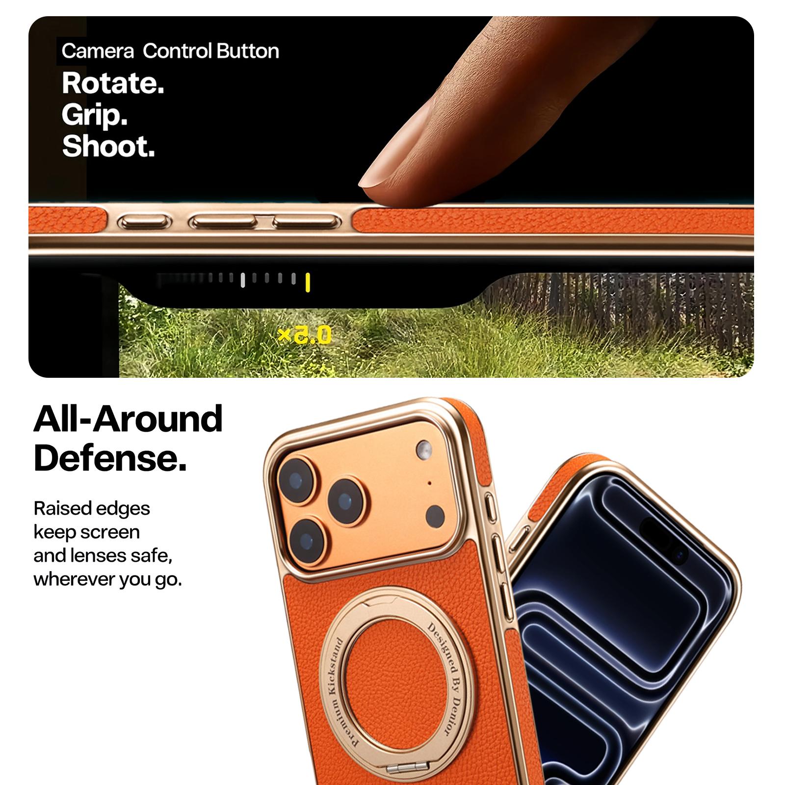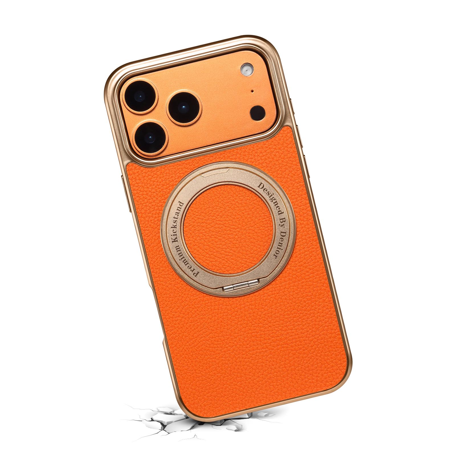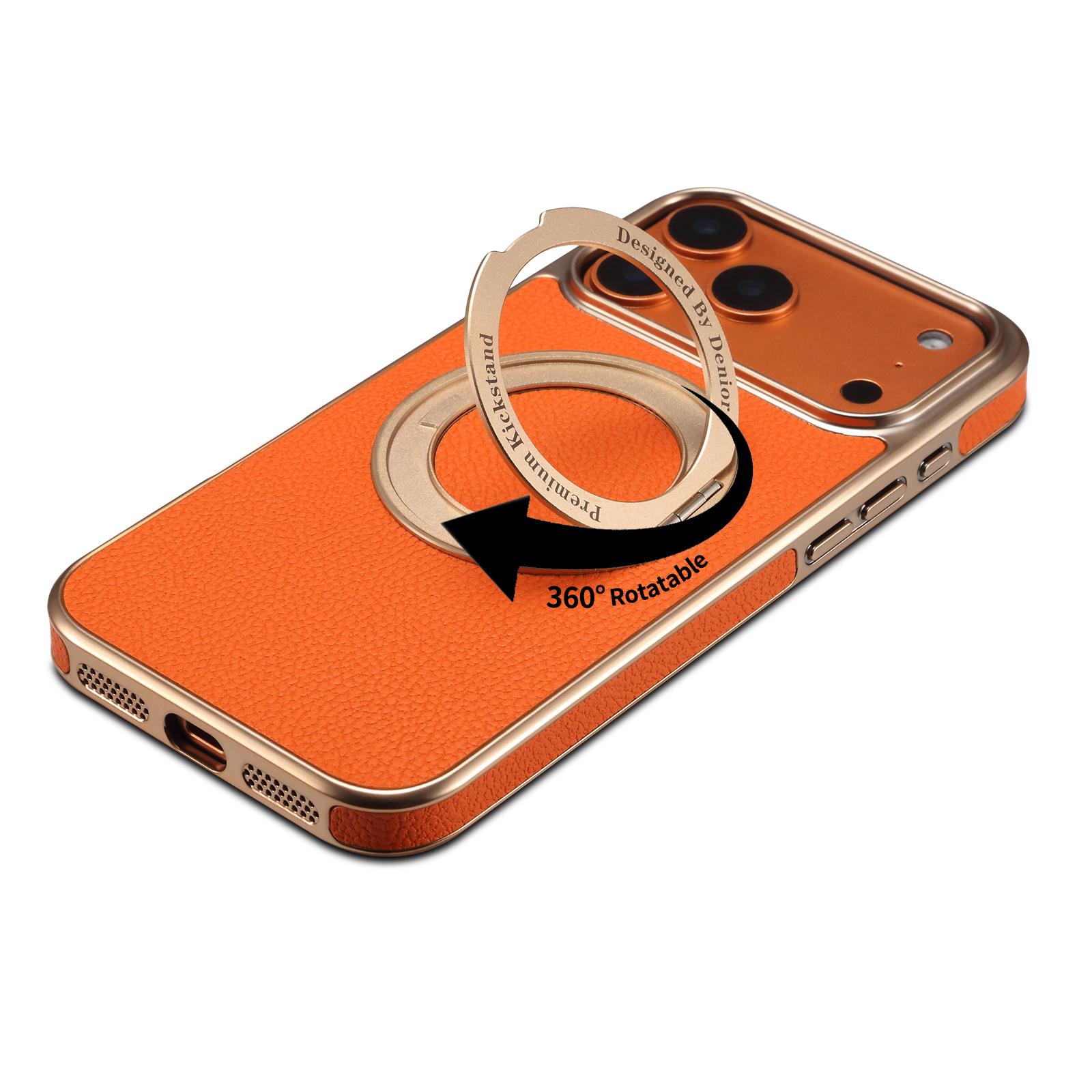 Denior Lychee Texture 360 Rotating Gear Kickstand Electroplated Phone Case for iPhone 17 Pro | PU Faux Leather | No Wireless Charging - Orange
