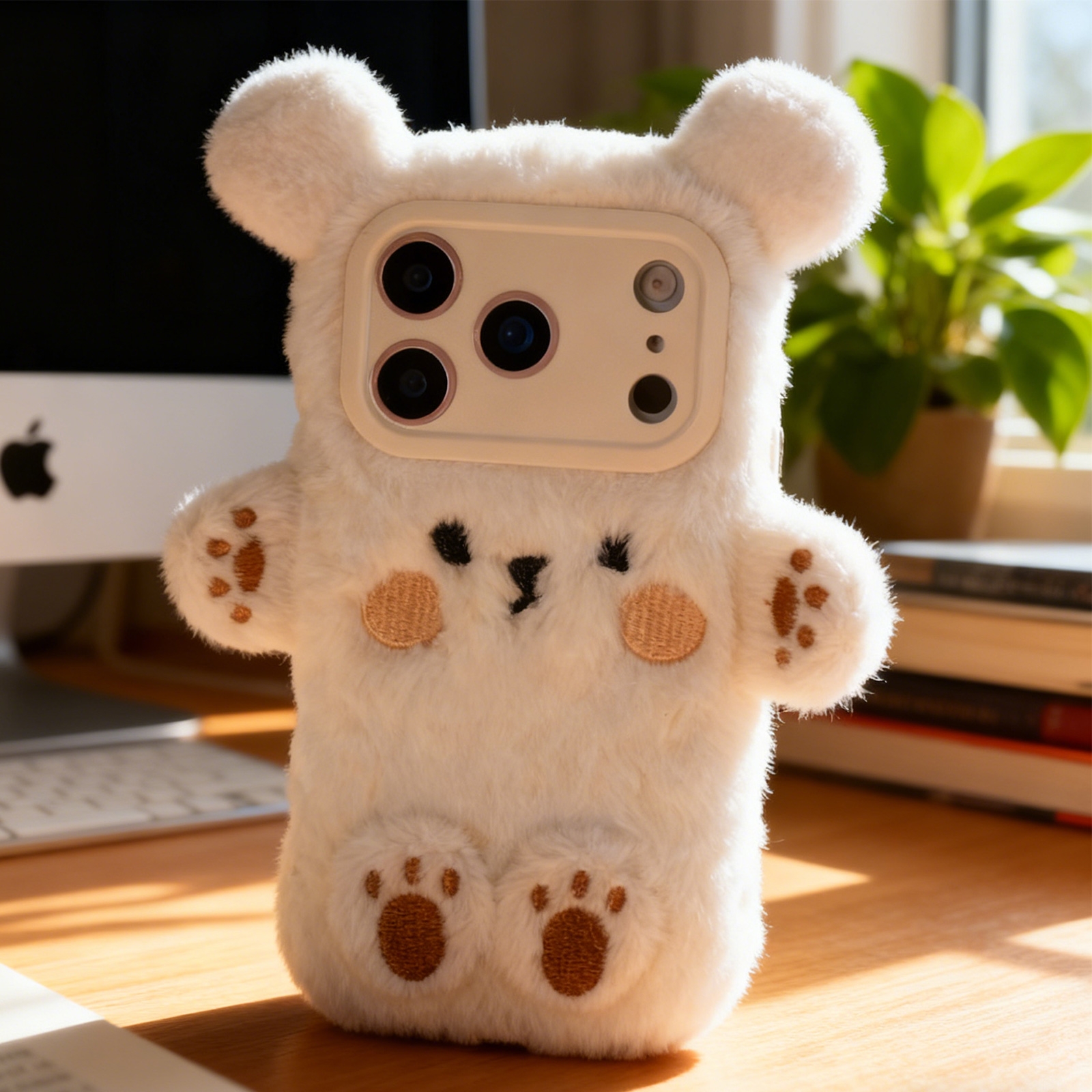 White Plush Silicone Bear Phone Case for iPhone 17 Pro Max – Soft Furry Cute Protective Cover