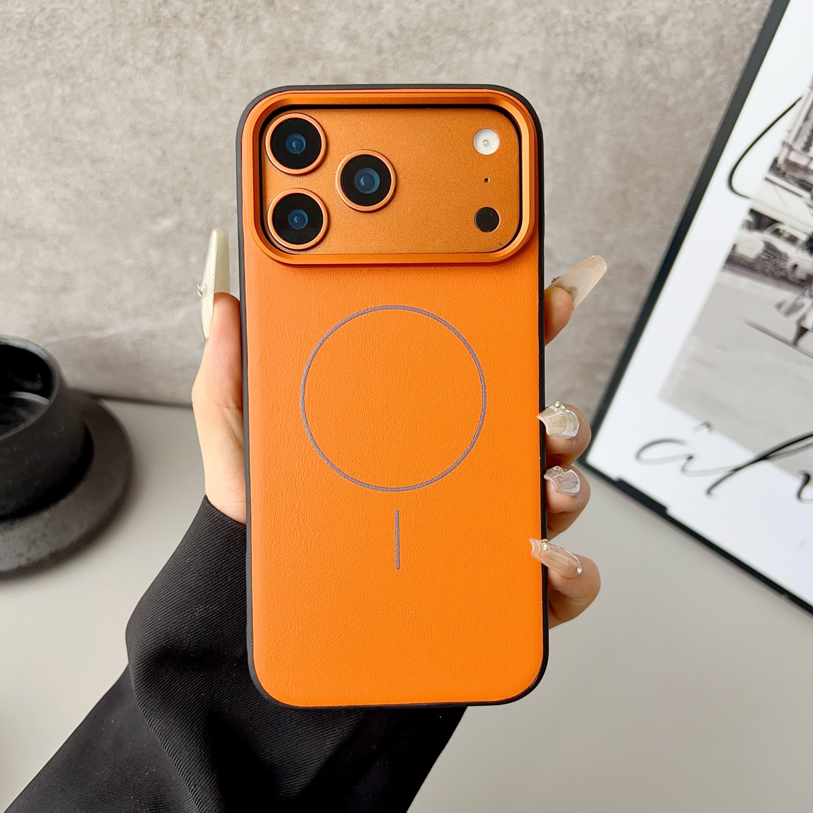 iPhone 17 Pro Max Leather-Wrapped Magnetic Case - Shockproof Hybrid Cover, Orange
