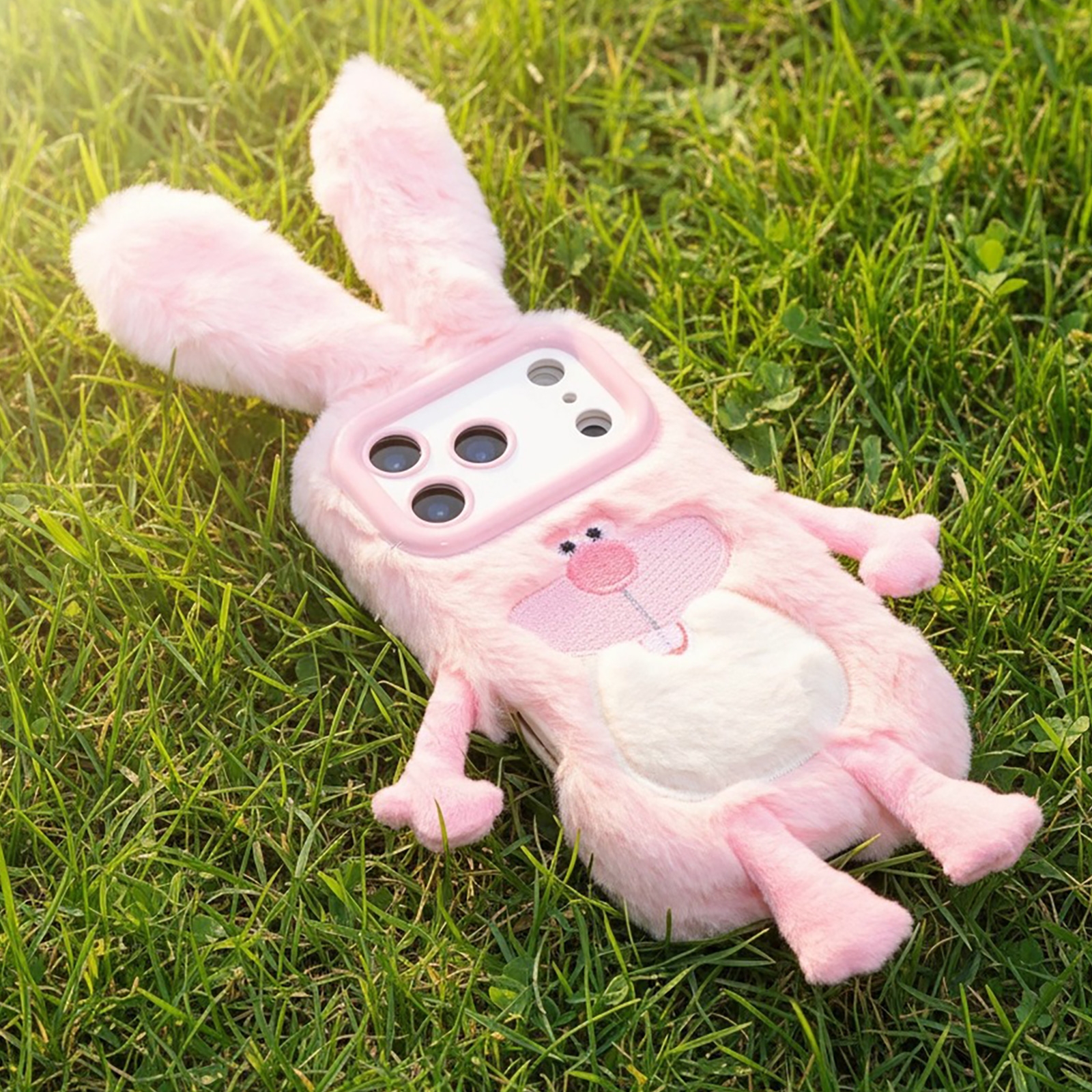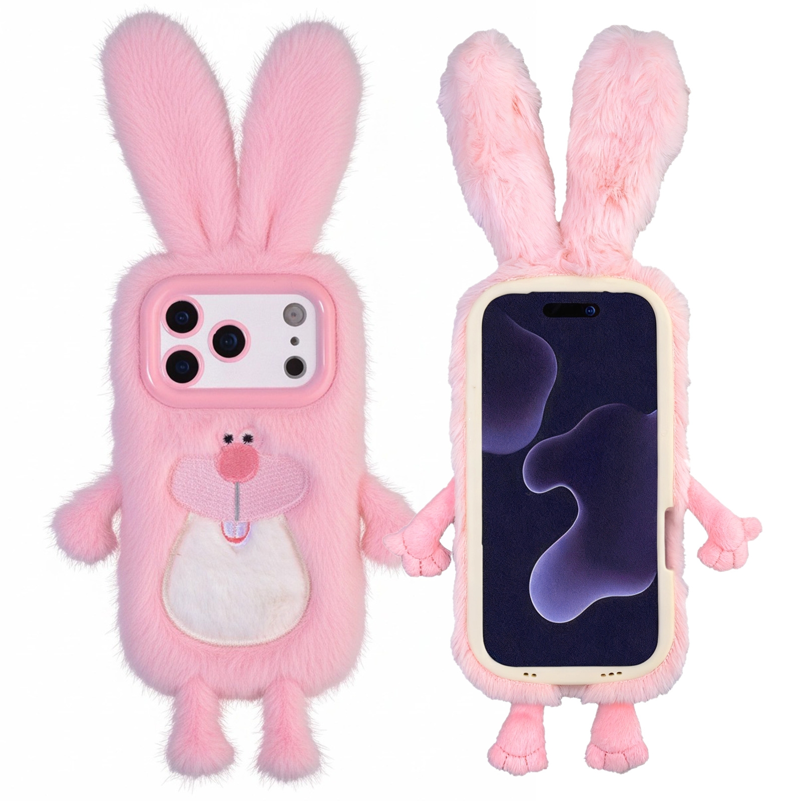 iPhone 17 Pro Max Plush Rabbit Case – Soft Furry Bucktooth Bunny Cover Pink