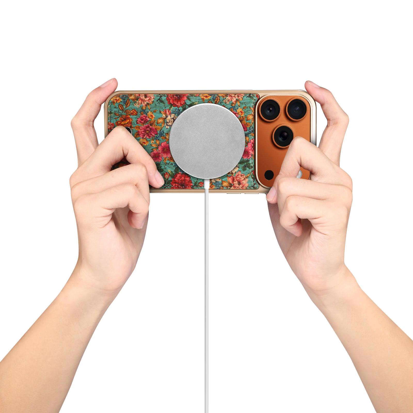 All pictures shown are for illustration purpose only. Actual product may vary due to product enhancement.Denior Printed Magnetic Detachable Electroplated Phone Case for iPhone 17 Pro Max | Cork Material | Wireless Charging Supported - Peony Blue