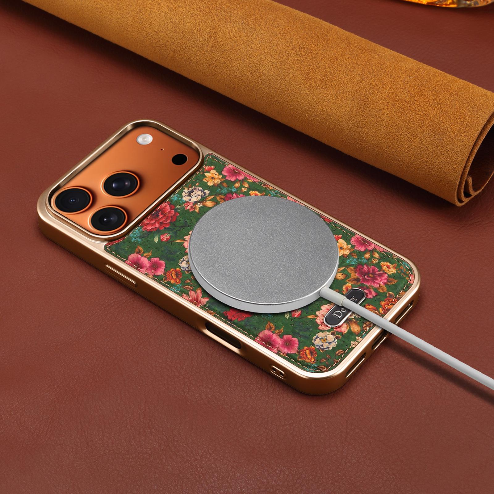 All pictures shown are for illustration purpose only. Actual product may vary due to product enhancement.Denior Printed Magnetic Detachable Electroplated Phone Case for iPhone 17 Pro Max | Cork Material | Wireless Charging Supported - Peony Green