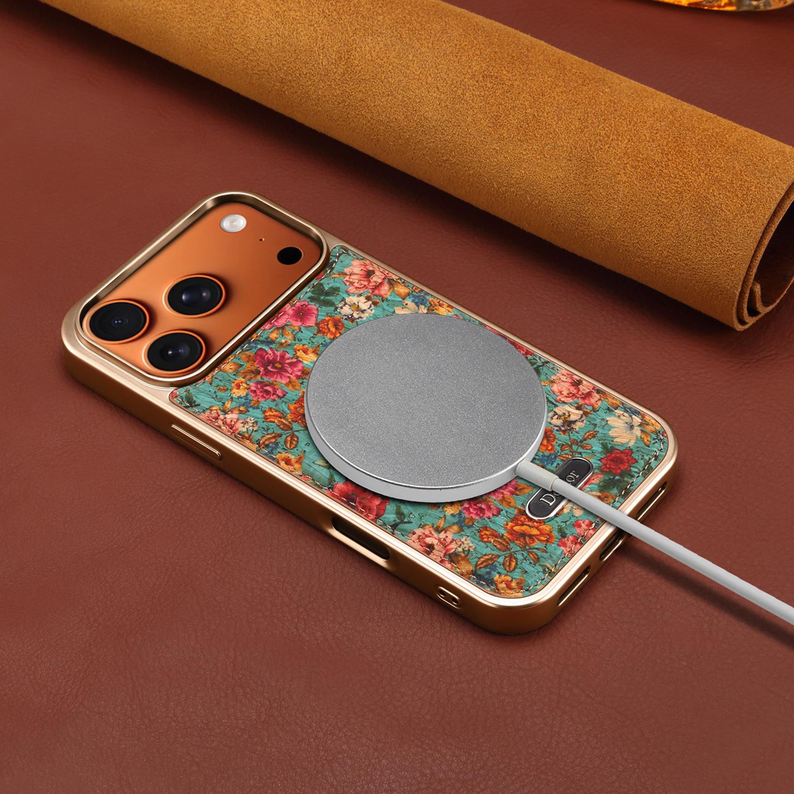 All pictures shown are for illustration purpose only. Actual product may vary due to product enhancement.Denior Printed Magnetic Detachable Electroplated Phone Case for iPhone 17 Pro | Cork Material | Wireless Charging Supported - Peony Blue