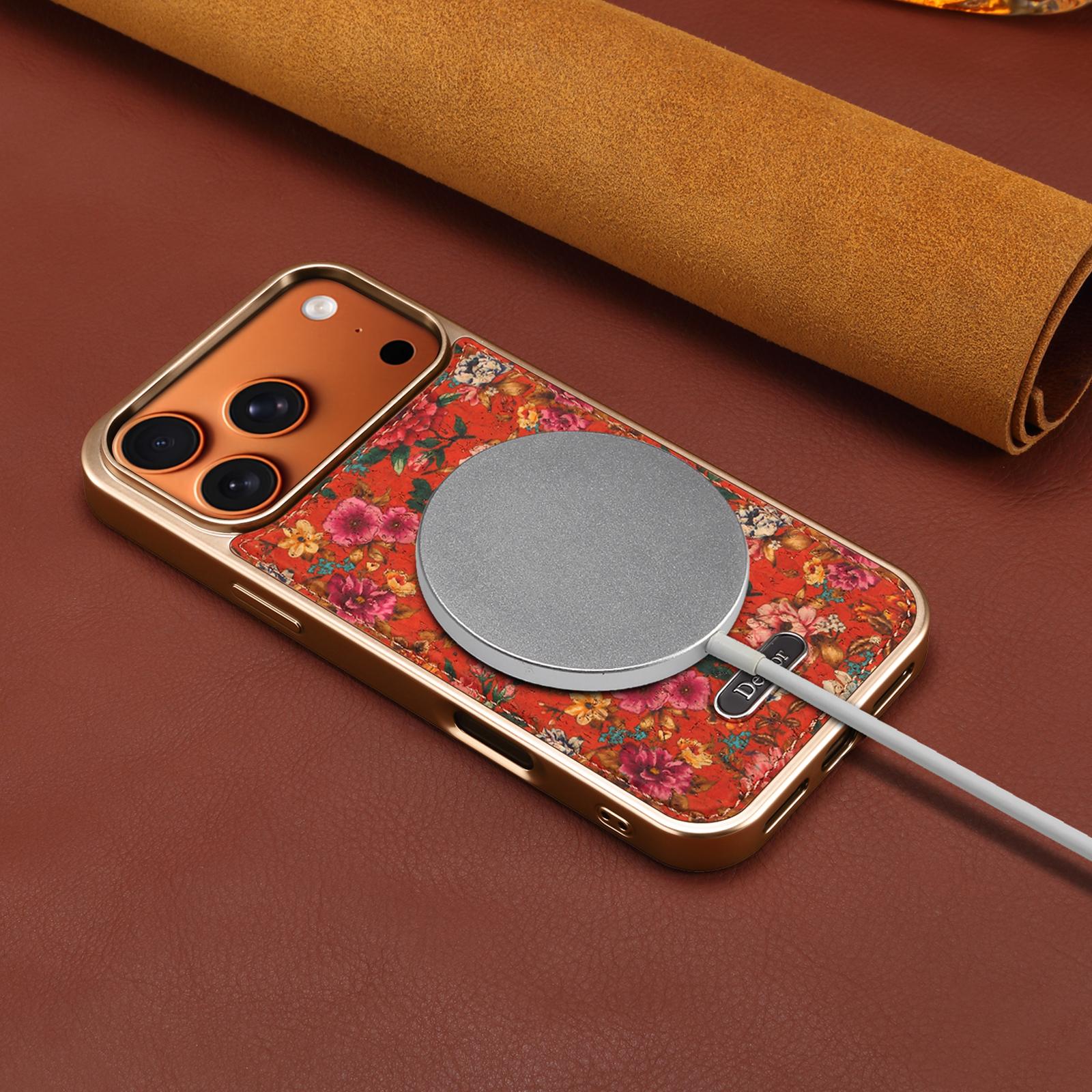 All pictures shown are for illustration purpose only. Actual product may vary due to product enhancement.Denior Printed Magnetic Detachable Electroplated Phone Case for iPhone 17 Pro | Cork Material | Wireless Charging Supported - Peony Red