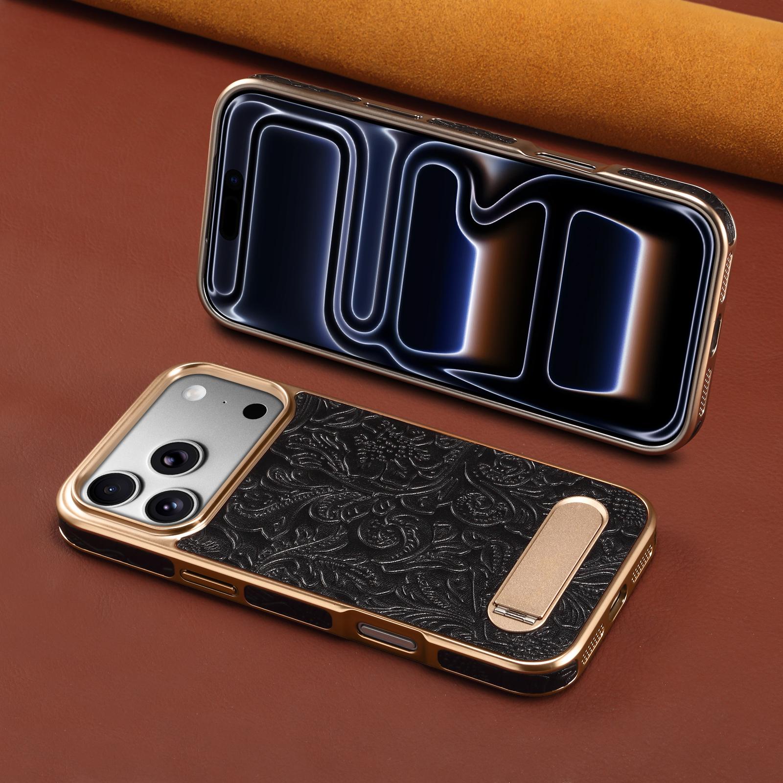 All pictures shown are for illustration purpose only. Actual product may vary due to product enhancement.Denior Retro Tang-style Flower Single-Stand Electroplated Phone Case for iPhone 17 Pro | Genuine Cowhide Leather | Wireless Charging Supported - Black