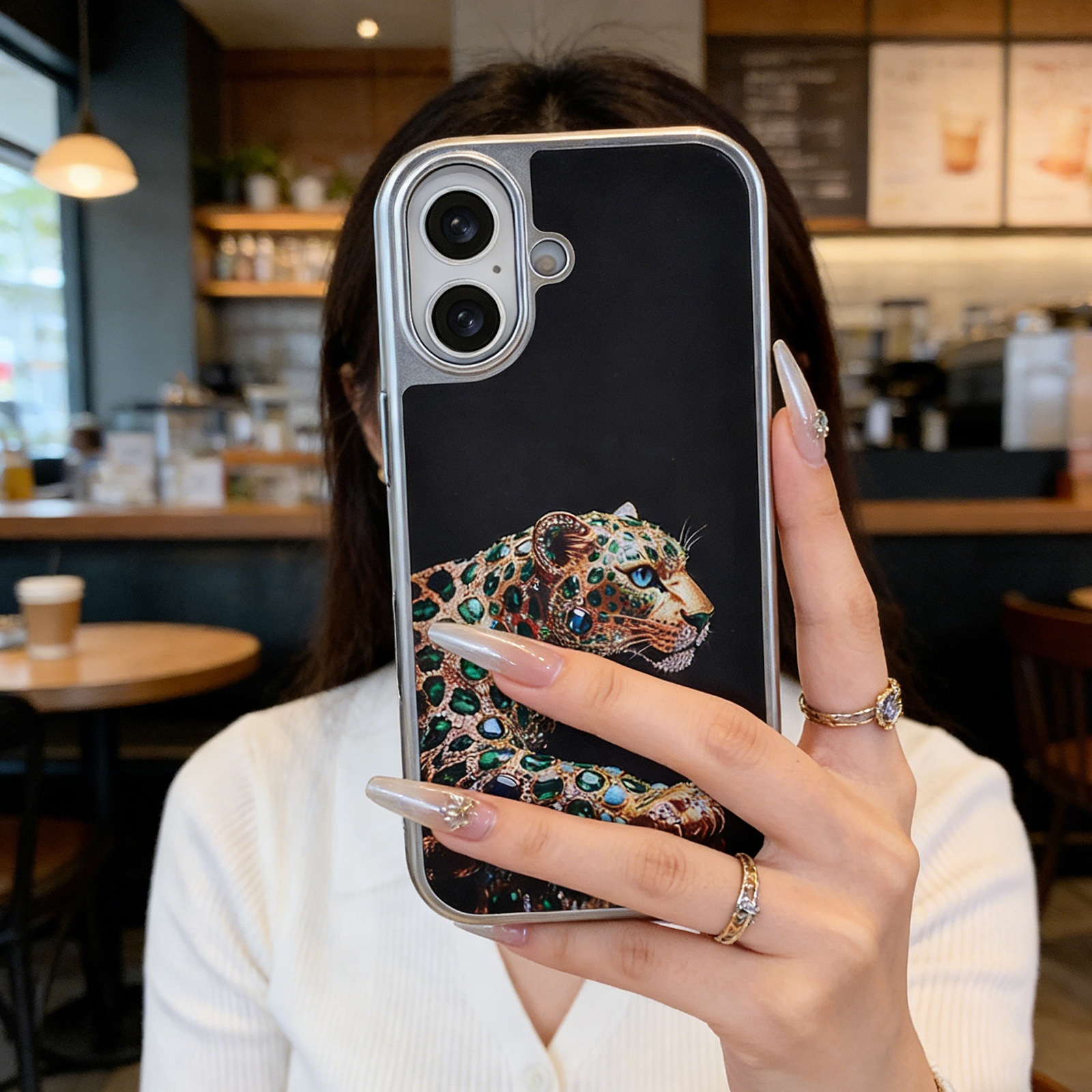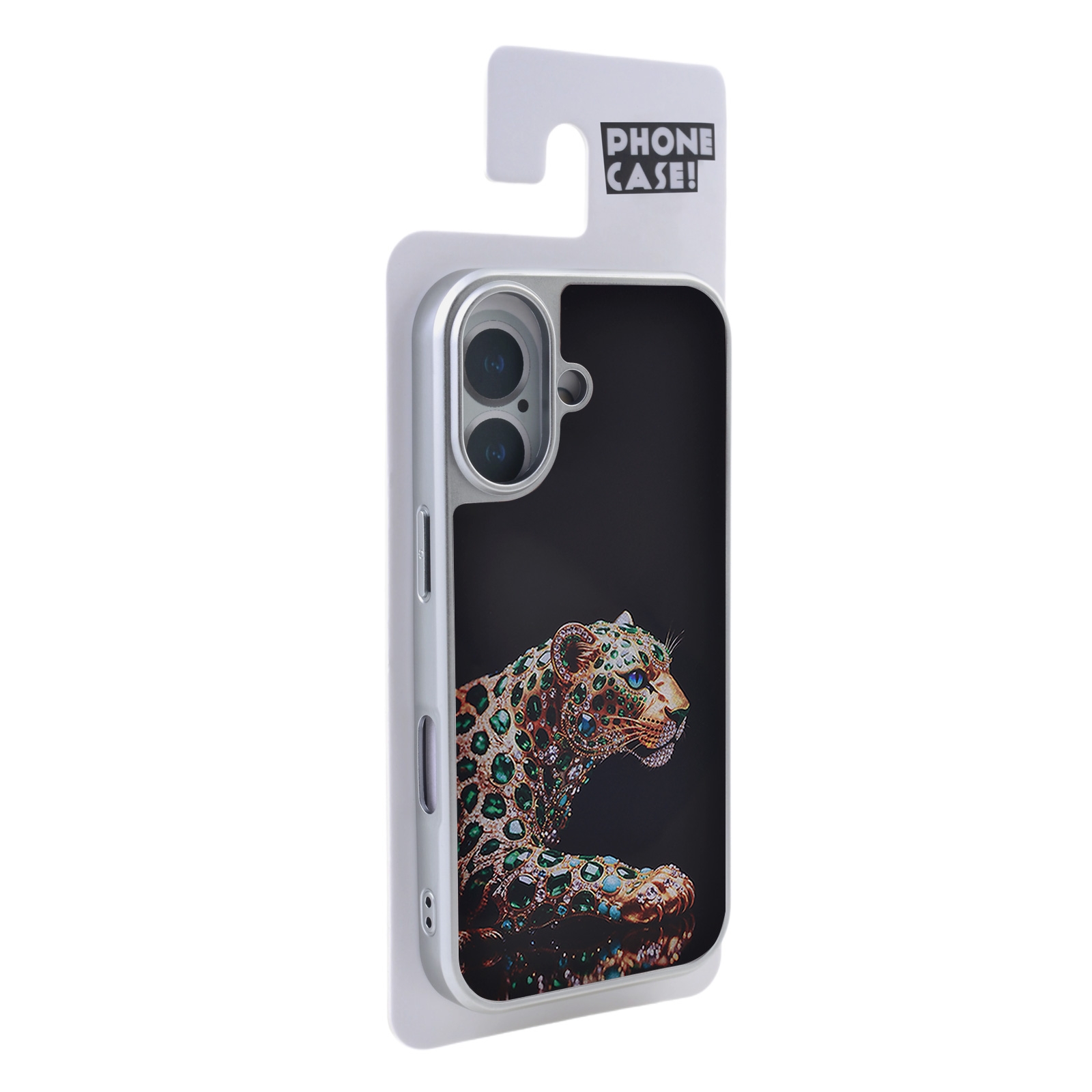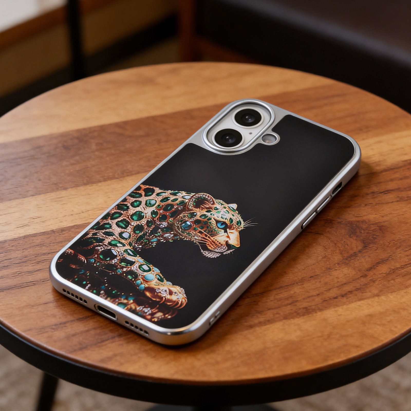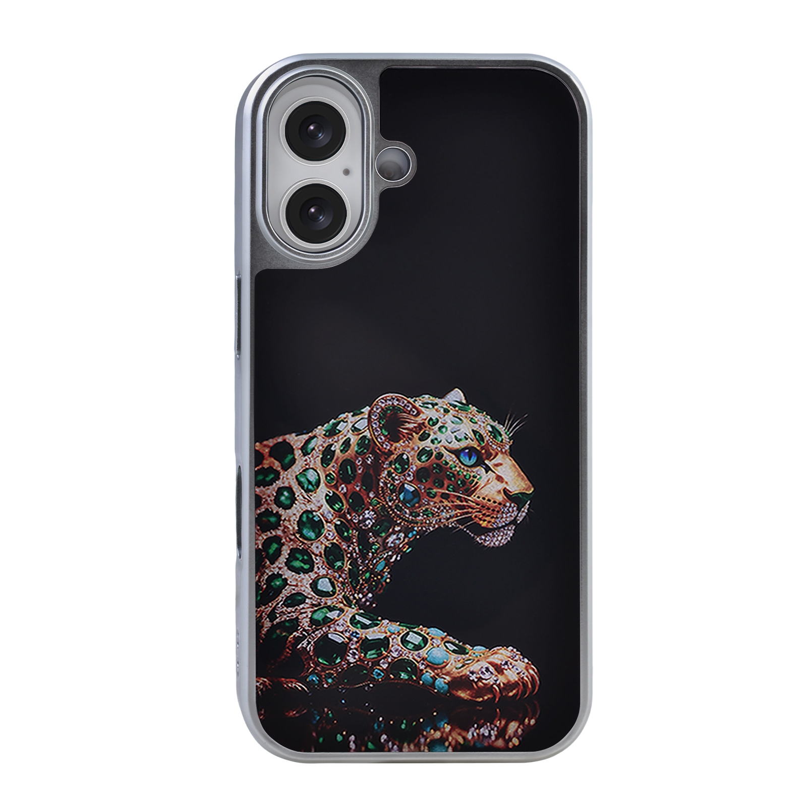 - Opulent Gemstone Graphic - The back panel displays a high-resolution, printed illustration of a leopard styled entirely from green gemstone and gold-tone motifs against a deep black background