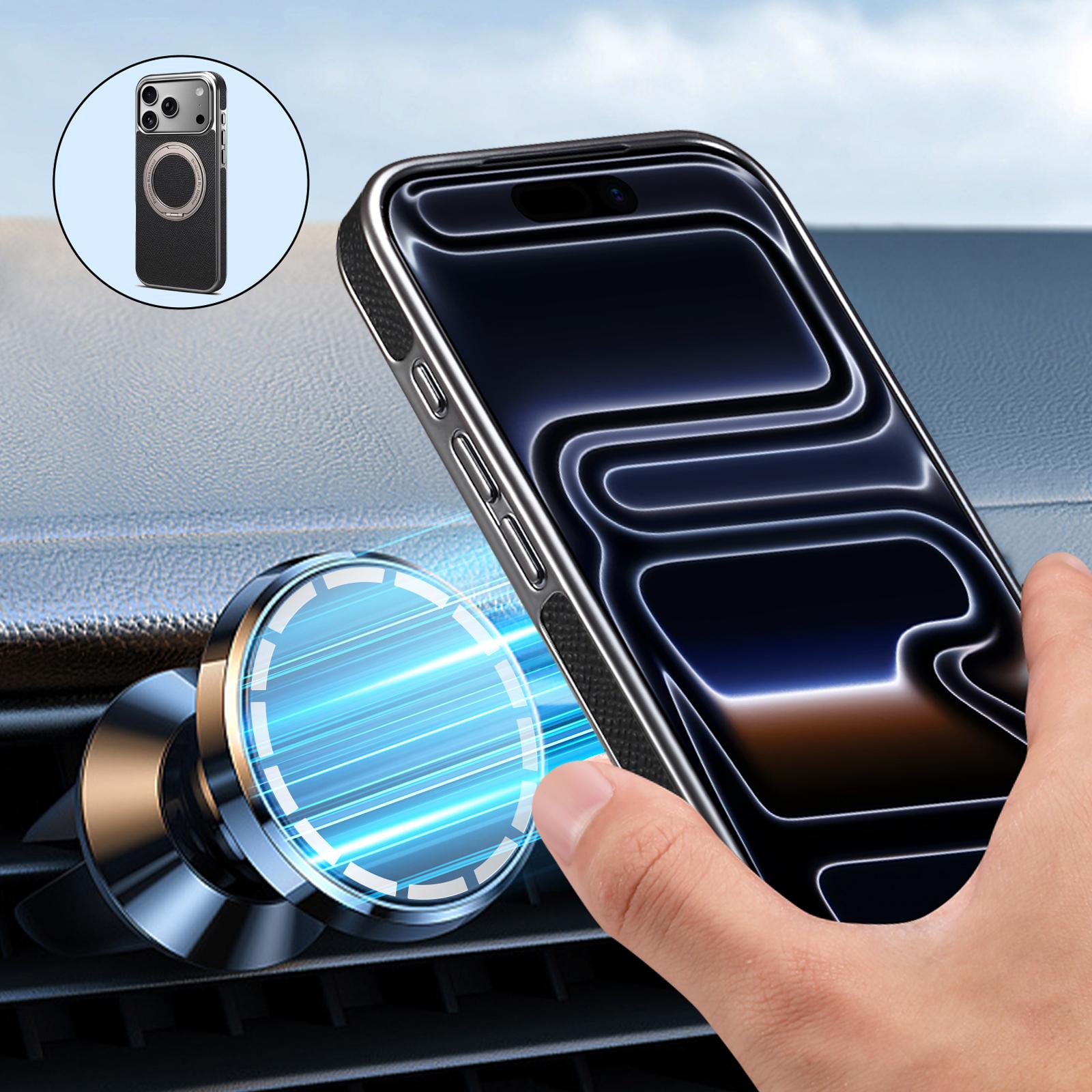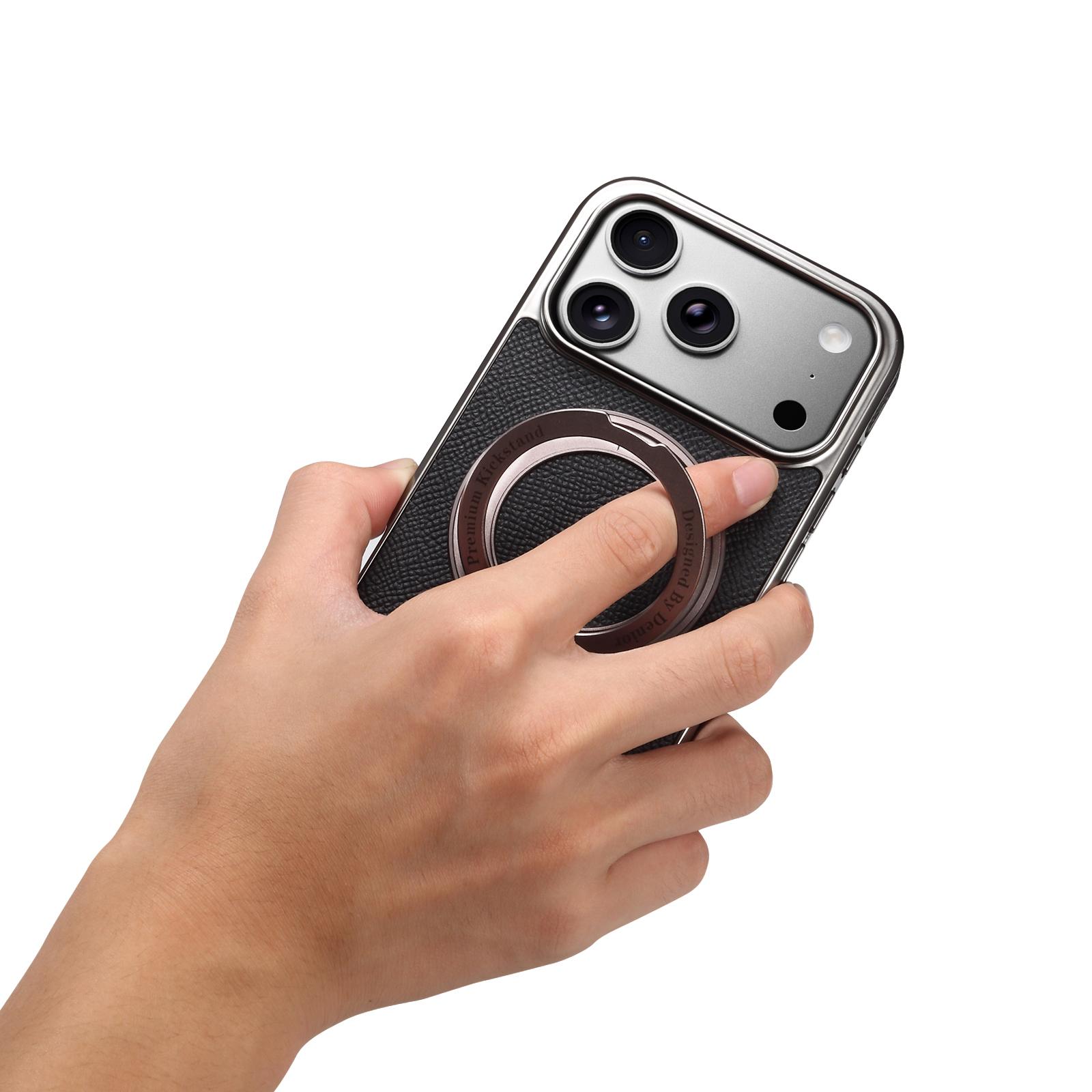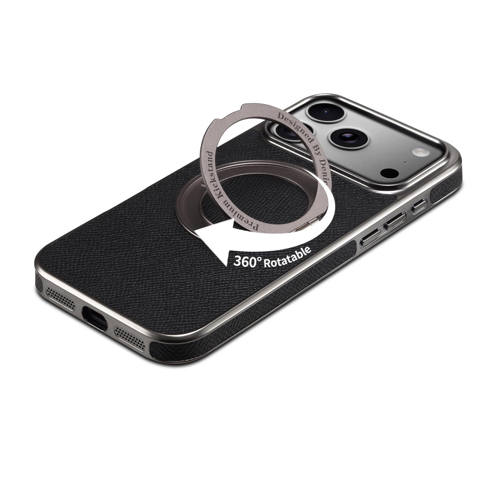 Denior Magnetic Gear Rotating Stand Phone Case for iPhone 17 Pro Max | Genuine Cowhide Leather | Fingerprint-Resistant Electroplated Case - Black