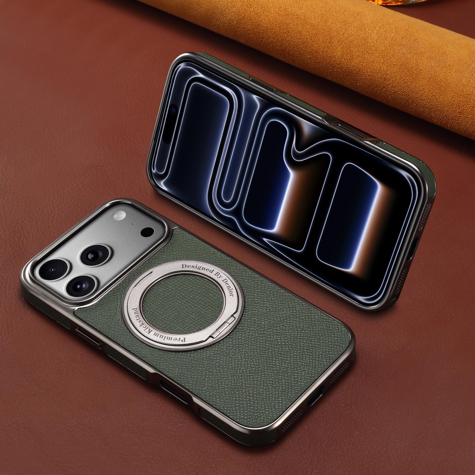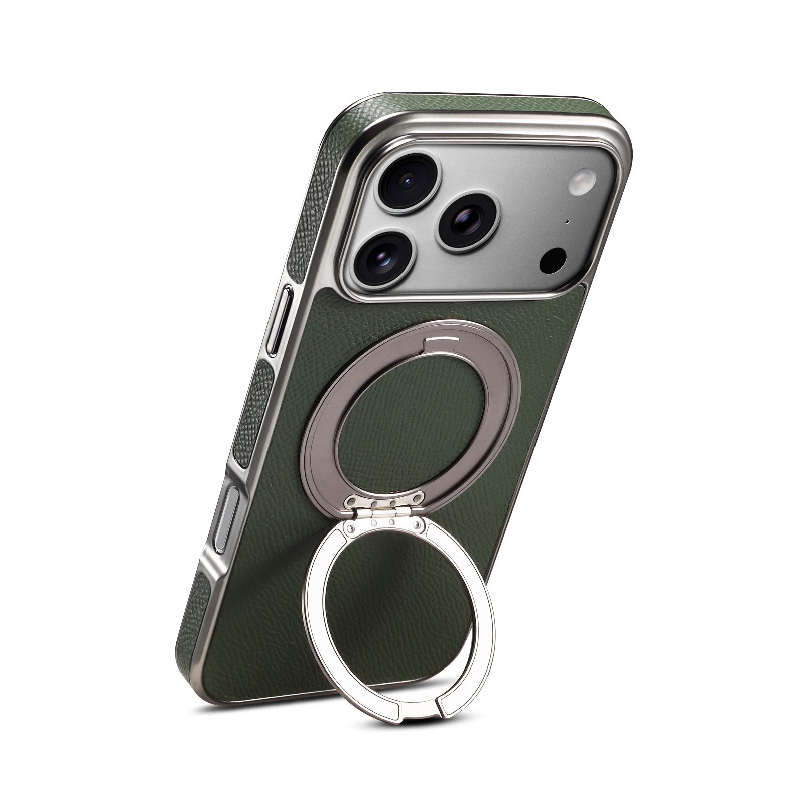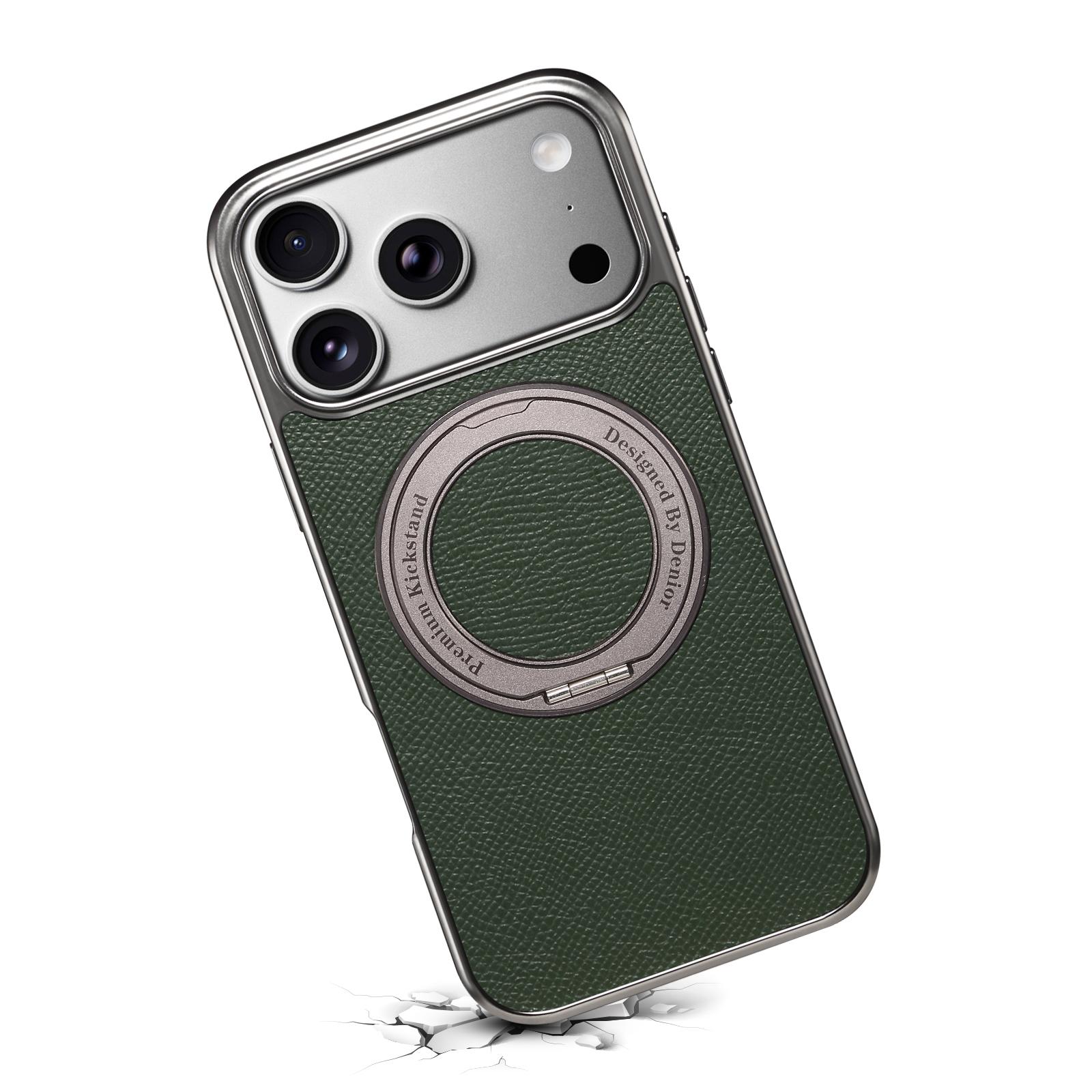 Denior Magnetic Gear Rotating Stand Phone Case for iPhone 17 Pro Max | Genuine Cowhide Leather | Fingerprint-Resistant Electroplated Case - Green