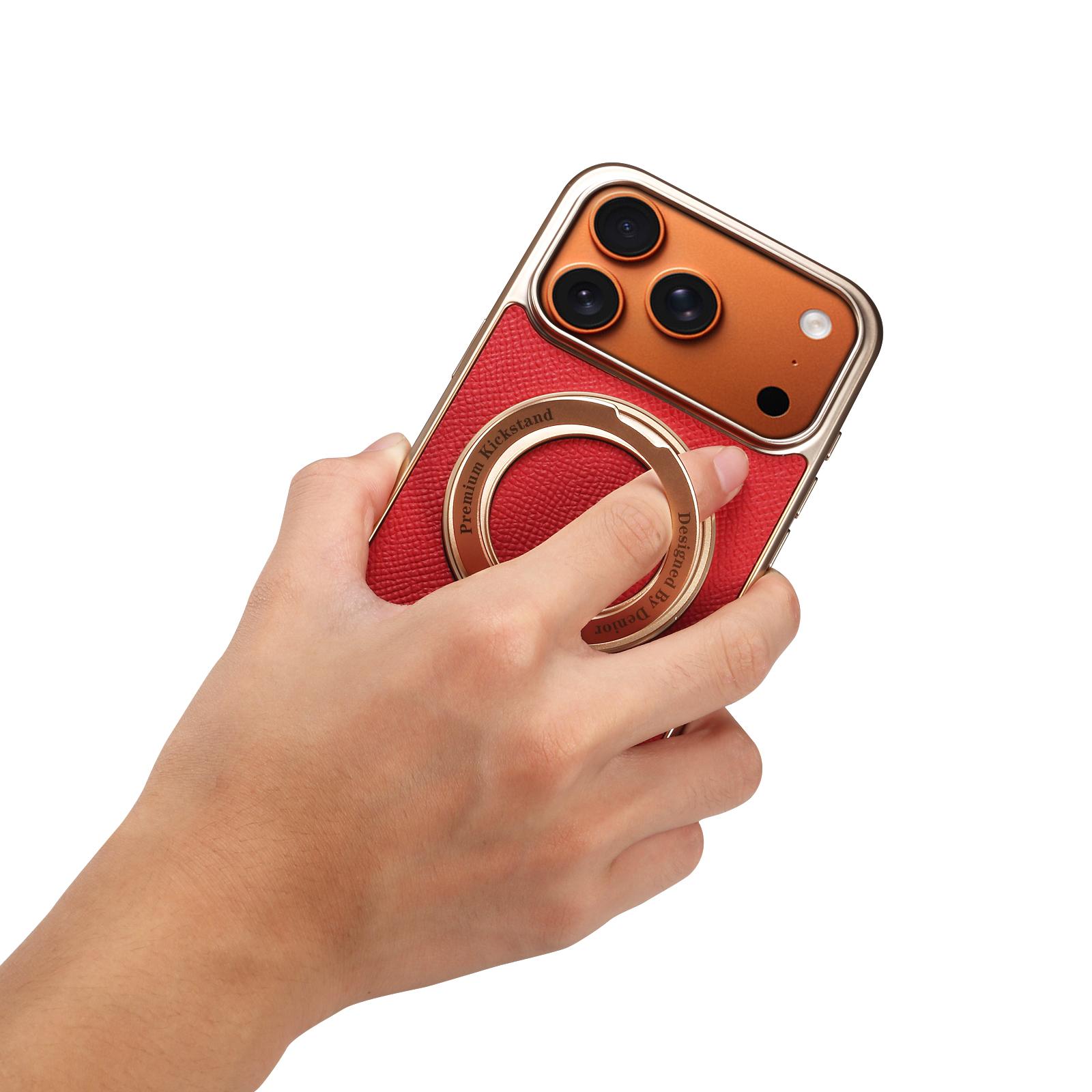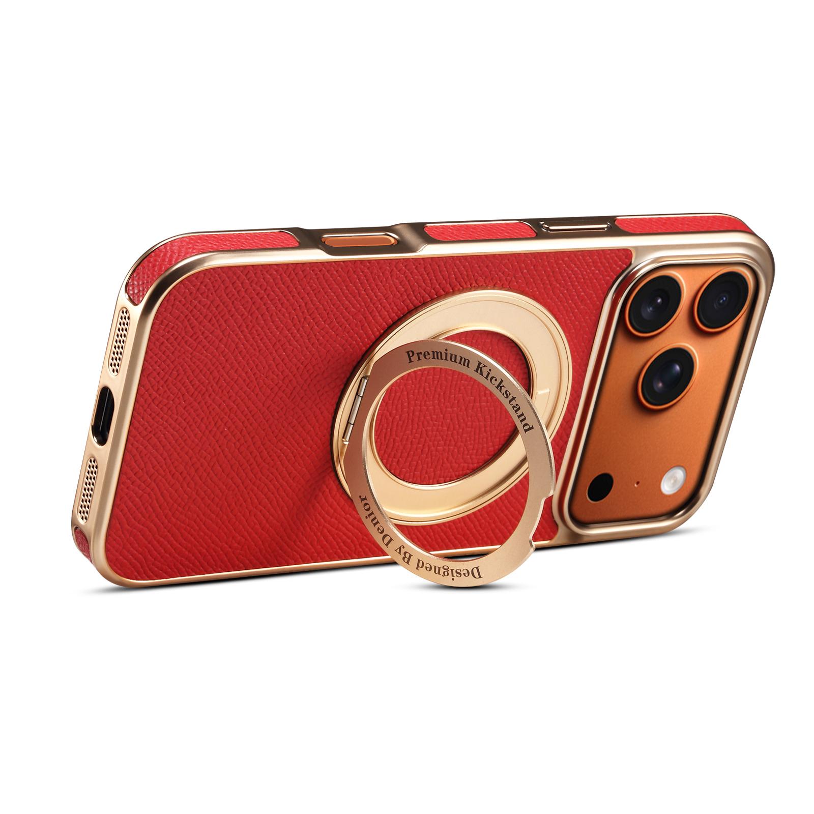 Denior Magnetic Gear Rotating Stand Phone Case for iPhone 17 Pro | Genuine Cowhide Leather | Fingerprint-Resistant Electroplated Case - Red