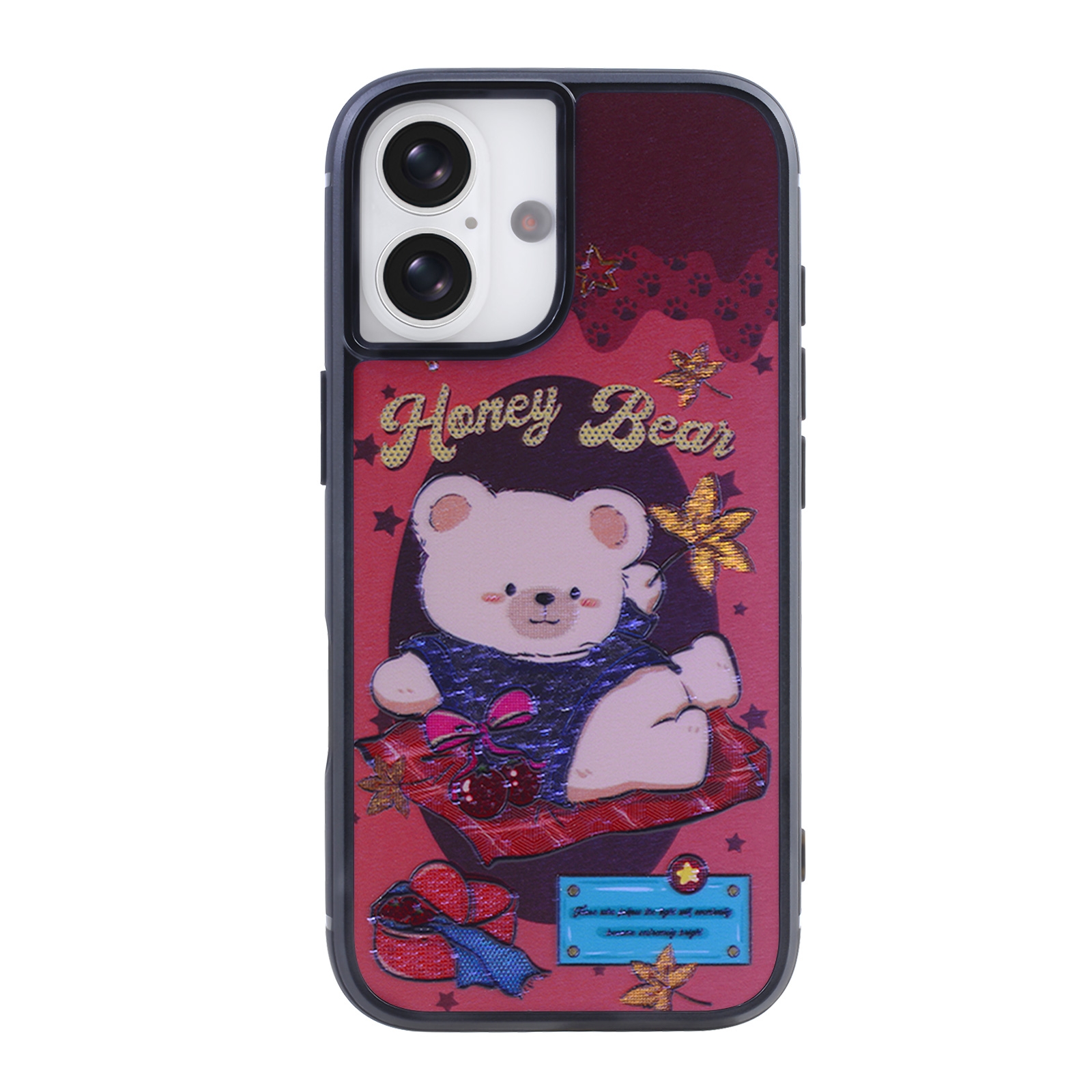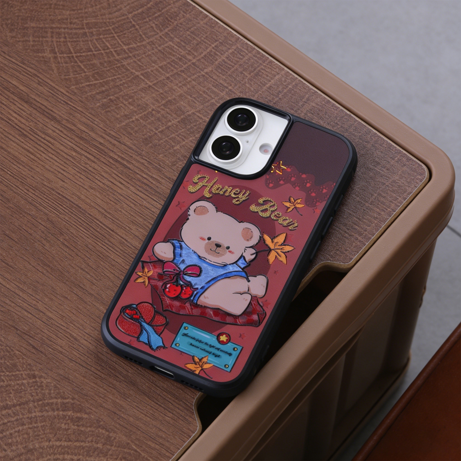 Maroon Magnetic Honey Bear Case for iPhone 17 - Cute Bear in Blue Sparkly Outfit & Fall Leaves Print