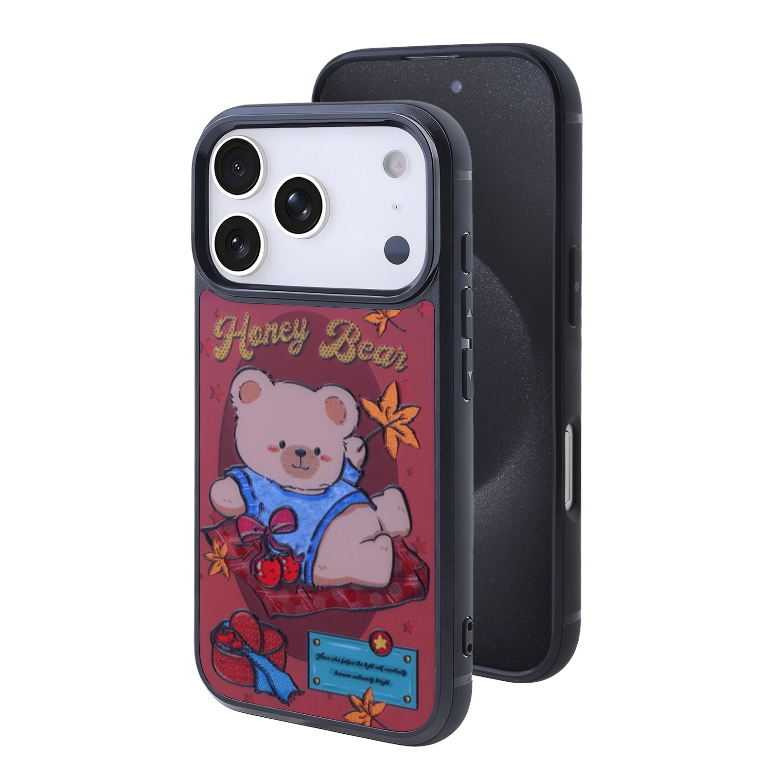 Maroon Magnetic Honey Bear Case for iPhone 17 Pro Max - Cute Bear in Blue Sparkly Outfit & Fall Leaves Print