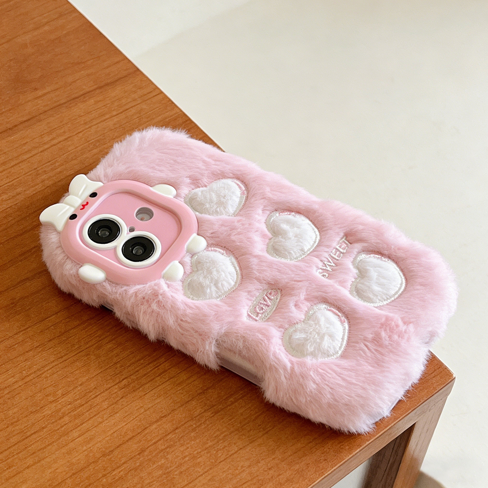 Pink Plush Silicone Phone Case with Five Hearts for iPhone 16 – Soft Furry Cute Protective Cover
