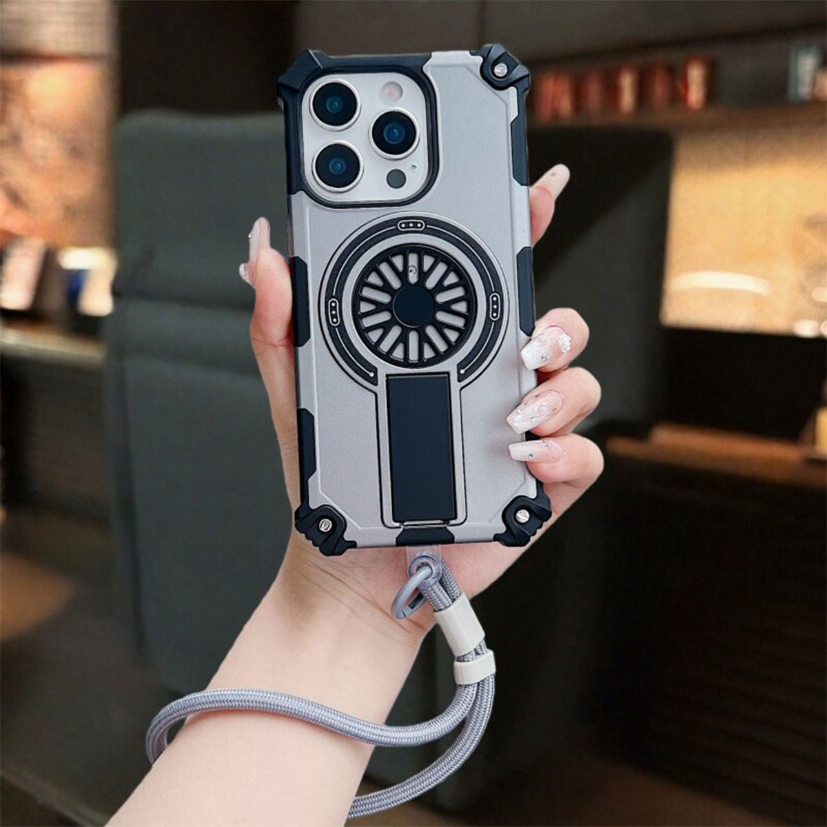 Rugged Magnetic Case with Foldable Kickstand & Wrist Strap for iPhone 17, Gray