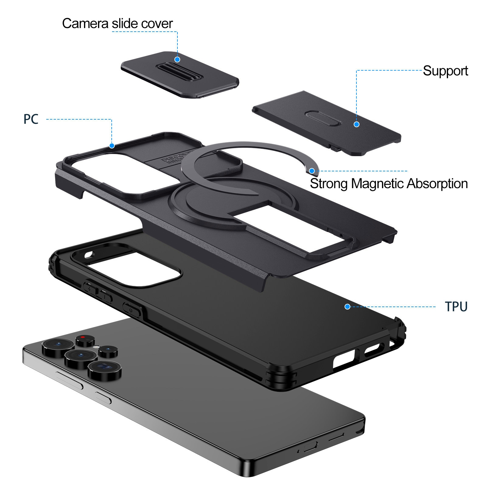 360 Rotation Kickstand Magnetic S26 Ultra Case - Airbag Shockproof Metal Stand, Black
