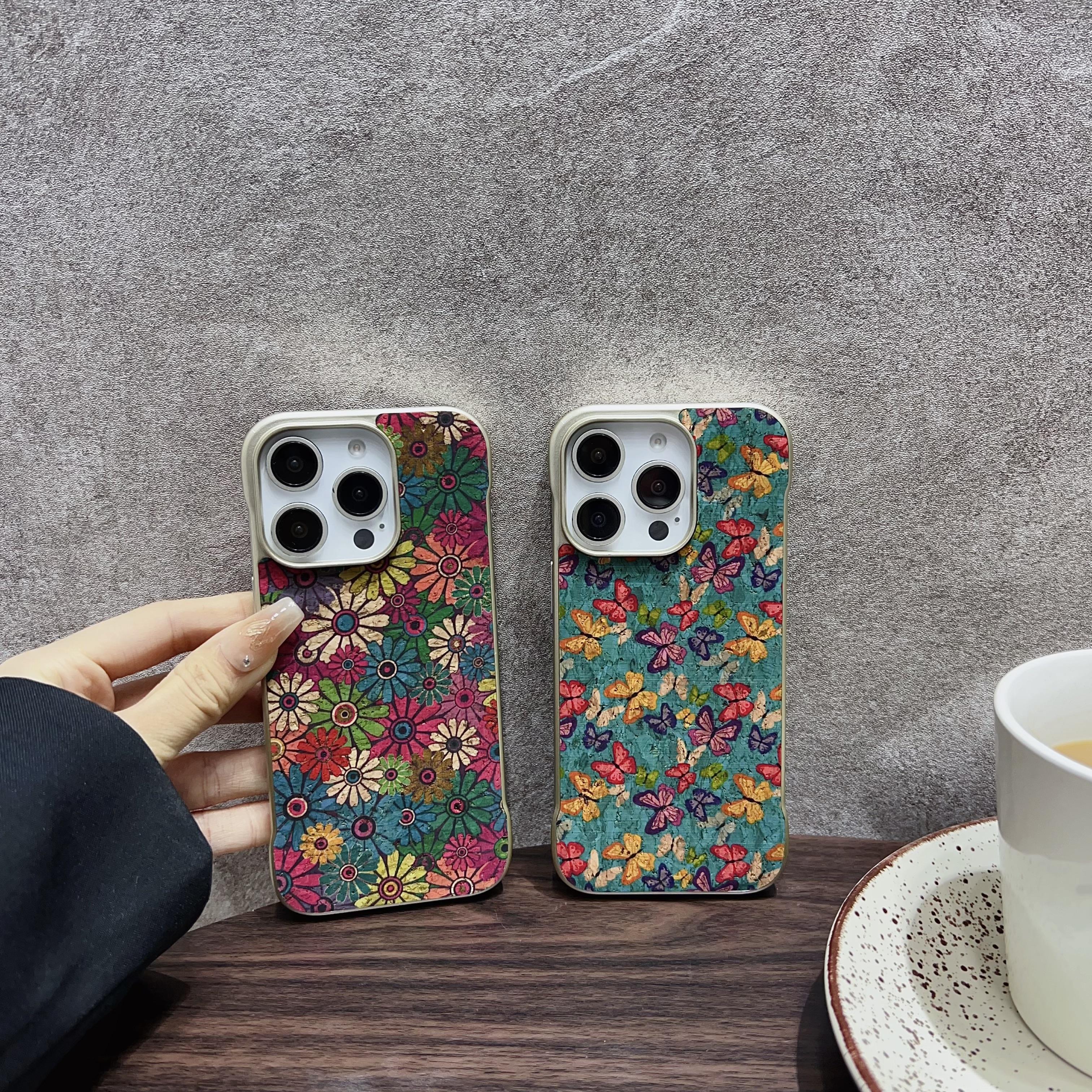 Denior Floral Pattern Frameless Phone Case for iPhone 16 Pro | Built-in N52 Magnet & MagSafe Wireless Charging Compatible | Eco-friendly Cork Material | Light Gold Painted Case - Sunflower