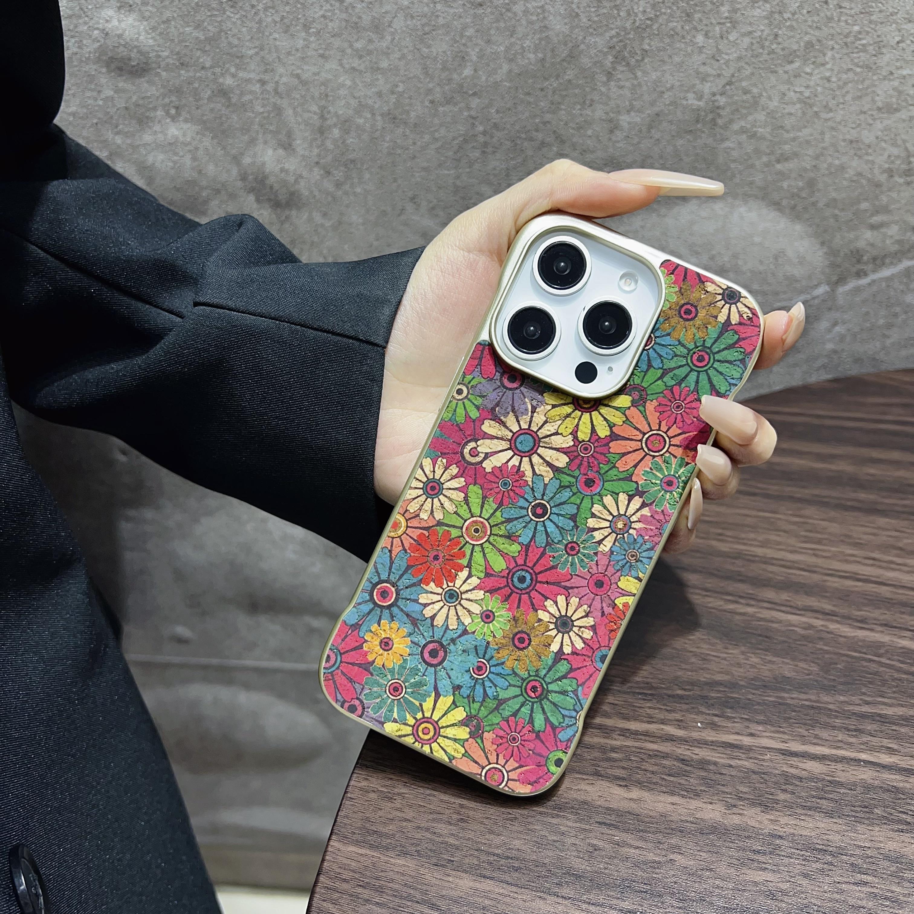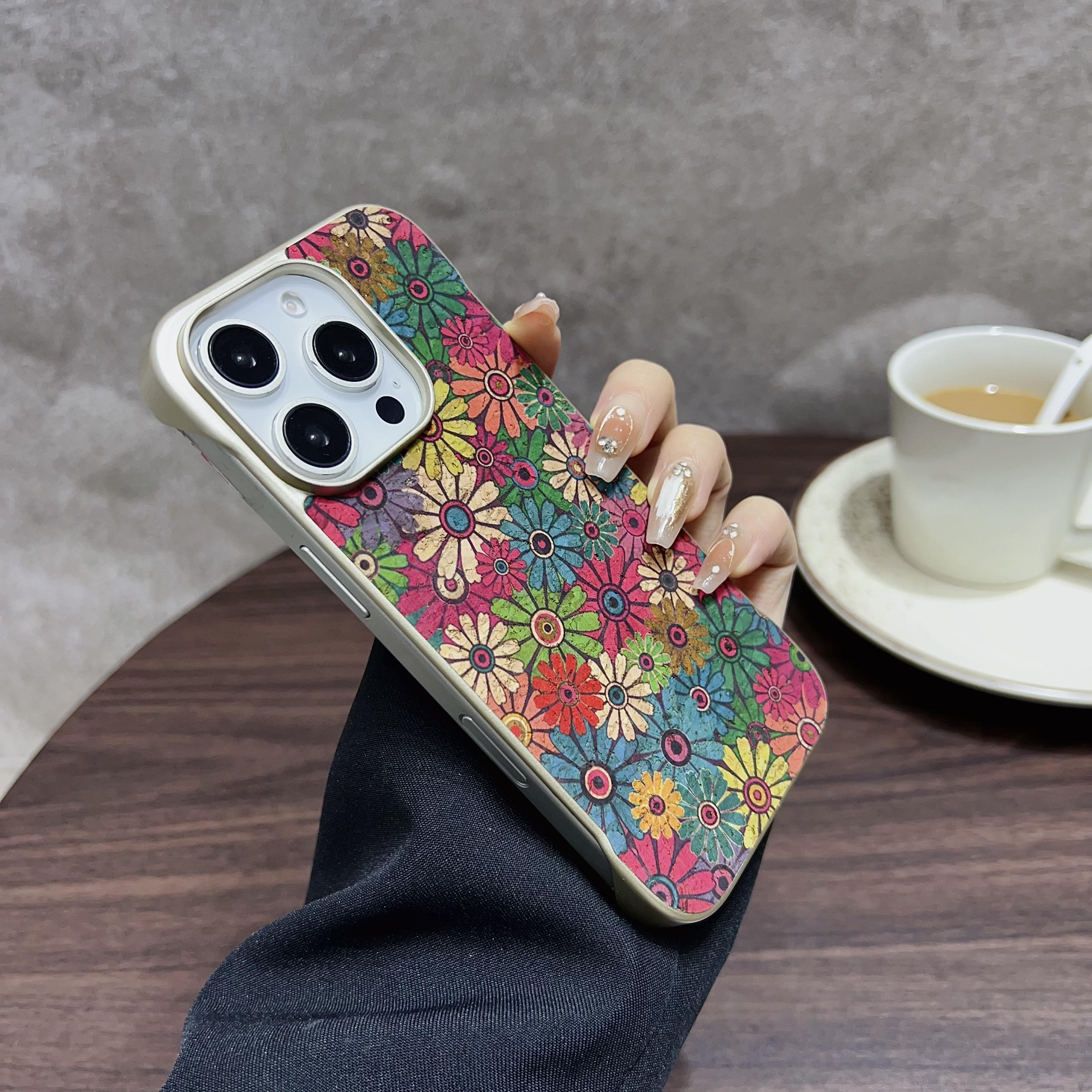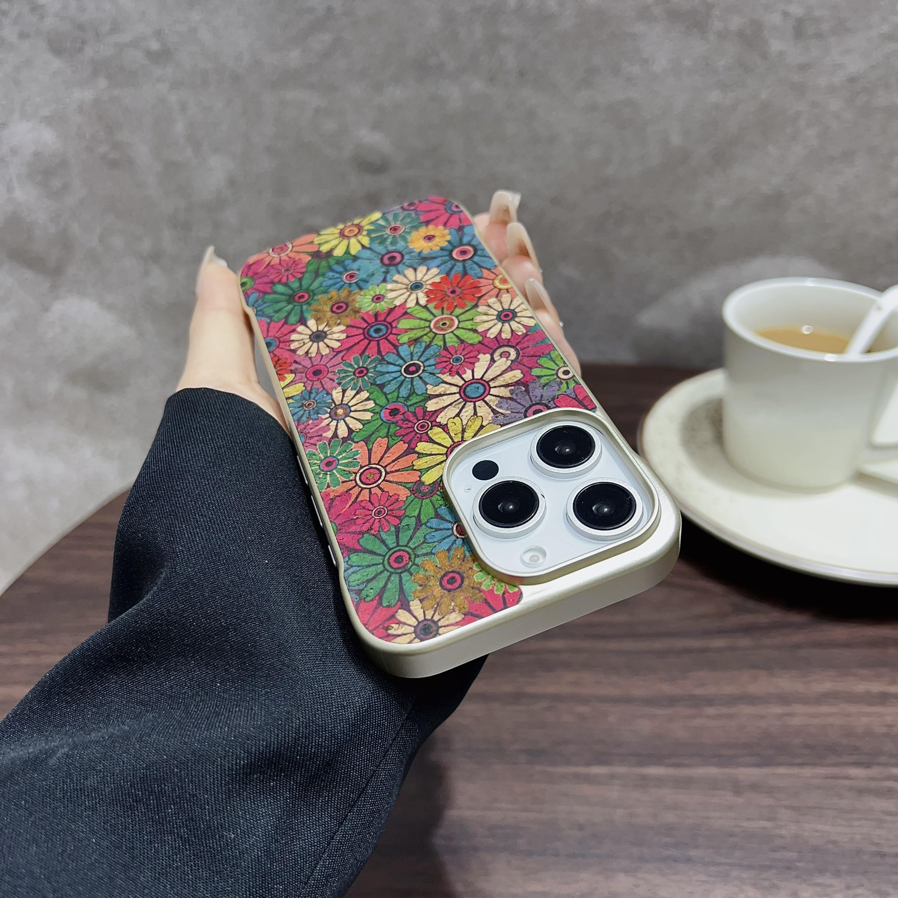 Denior Floral Pattern Frameless Phone Case for iPhone 16 Pro Max | Built-in N52 Magnet & MagSafe Wireless Charging Compatible | Eco-friendly Cork Material | Light Gold Painted Case - Sunflower