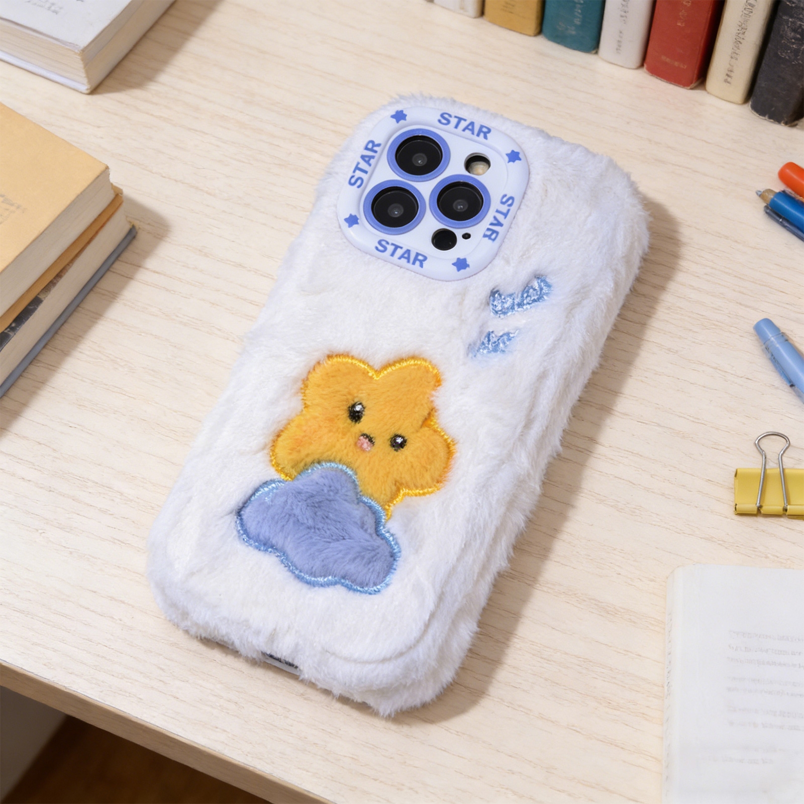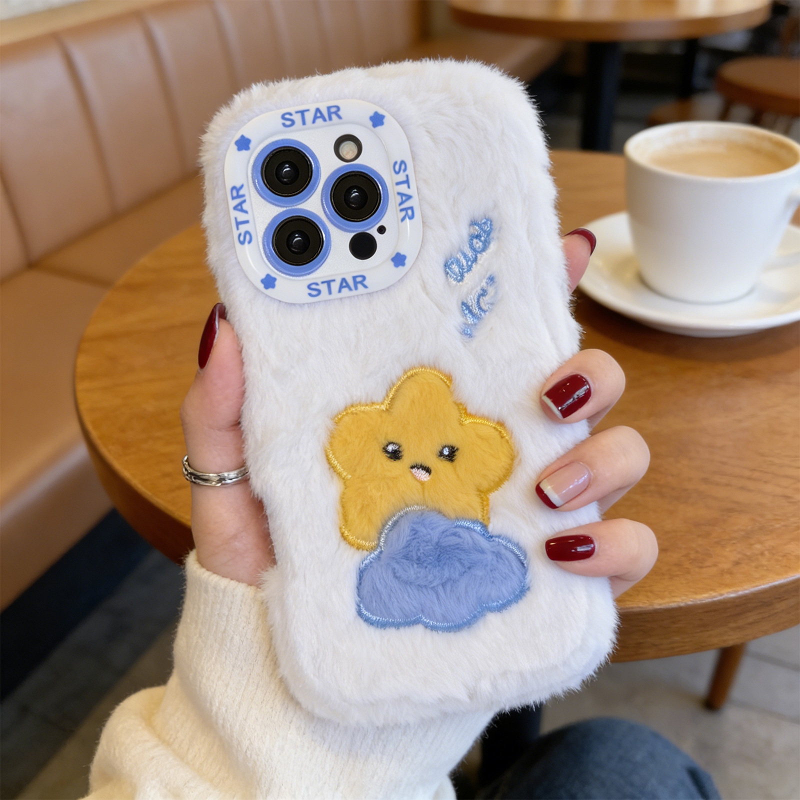 White Cloud Star Plush Silicone Phone Case for iPhone 16 Pro Max – Soft Cute Protective Cover