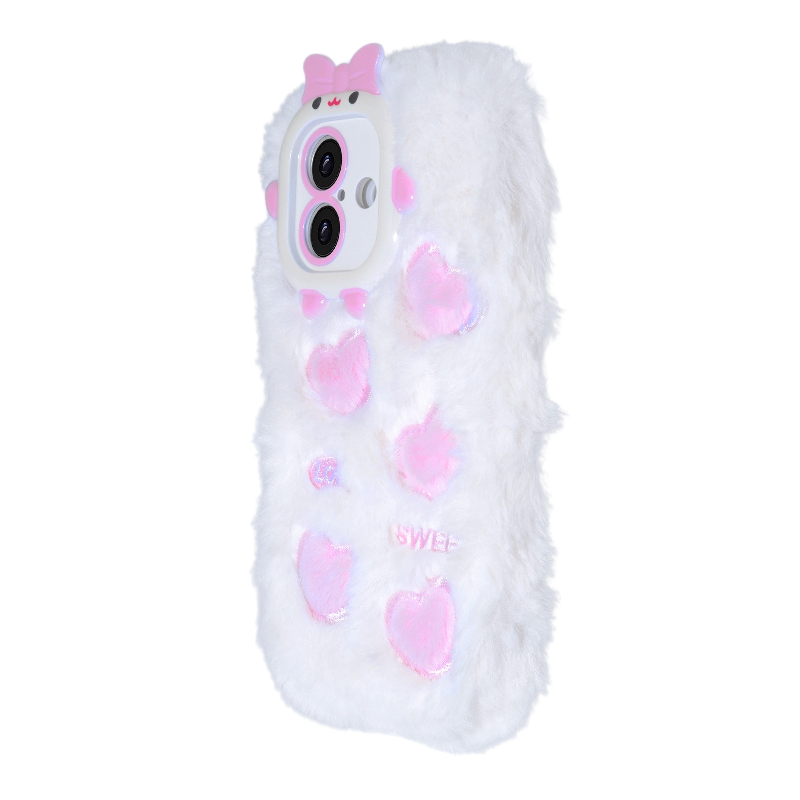 White Plush Silicone Double Heart Phone Case for iPhone 16 Plus – Soft Furry Cute Protective Cover