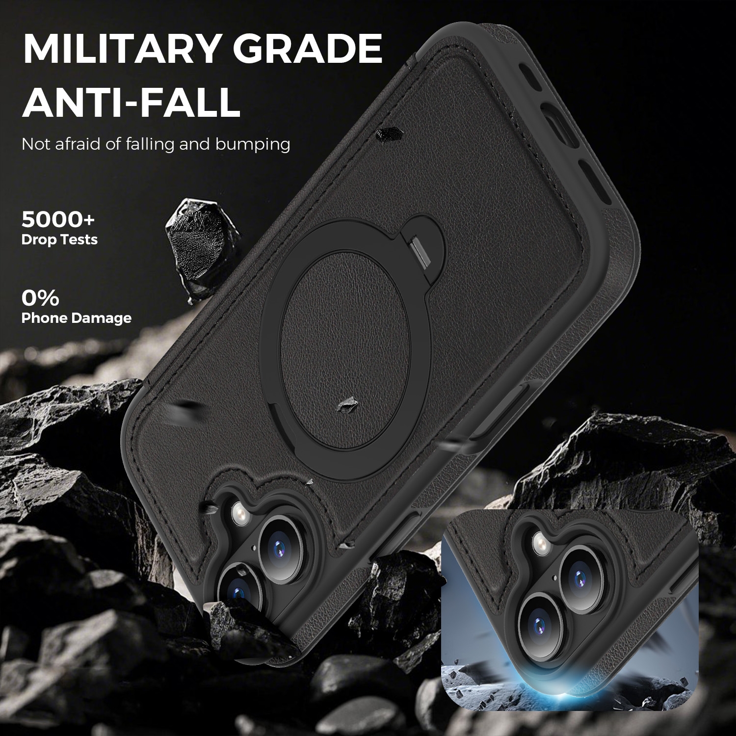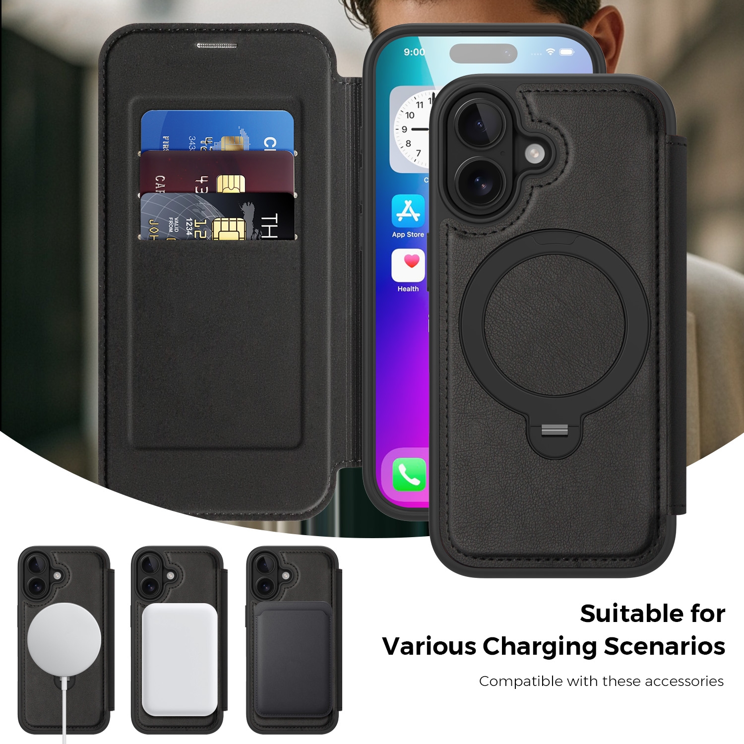 360° Rotating Stand iPhone 17 Case - Magnetic Wireless Charging PU Cover, Black