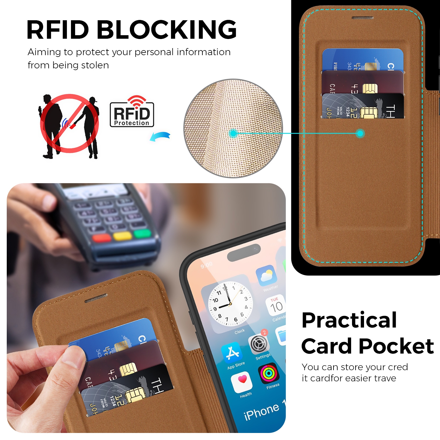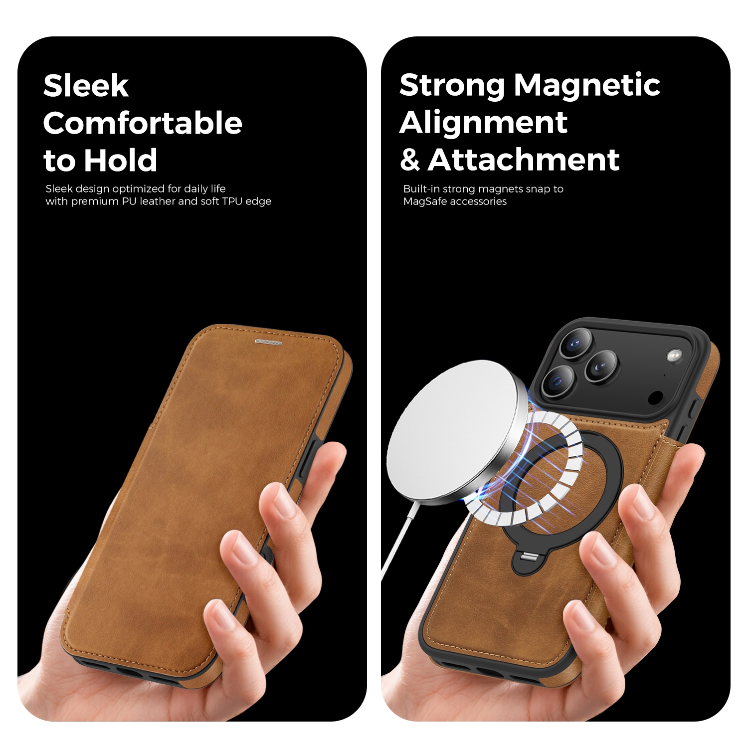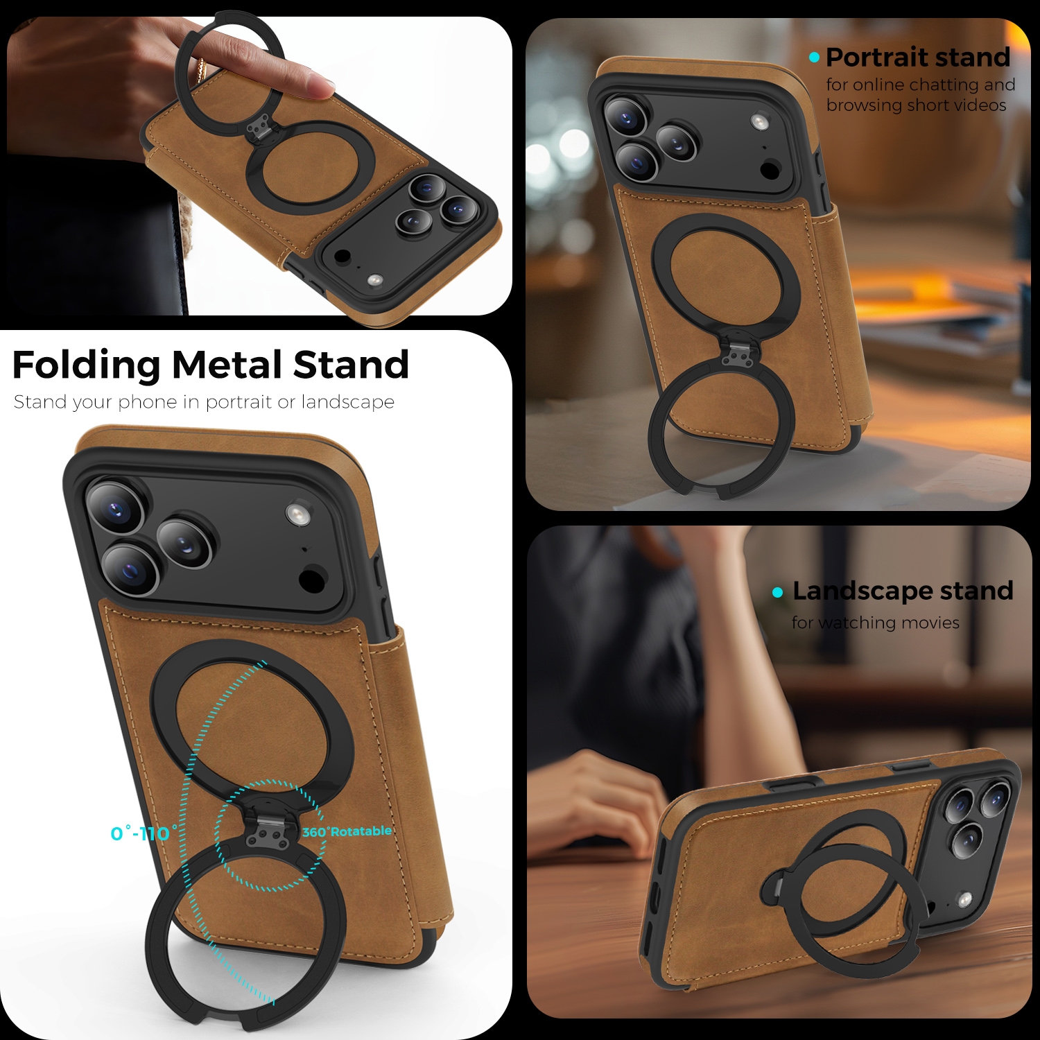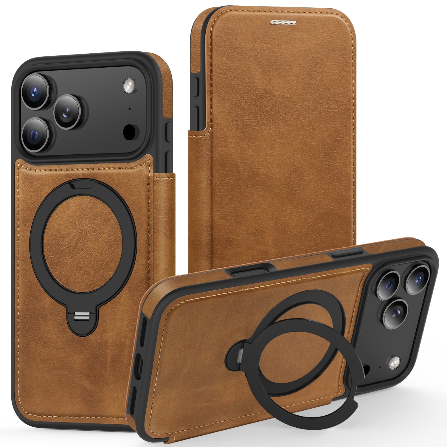 360° Rotating Stand iPhone 17 Pro Max Case - Magnetic Wireless Charging PU Cover, Brown