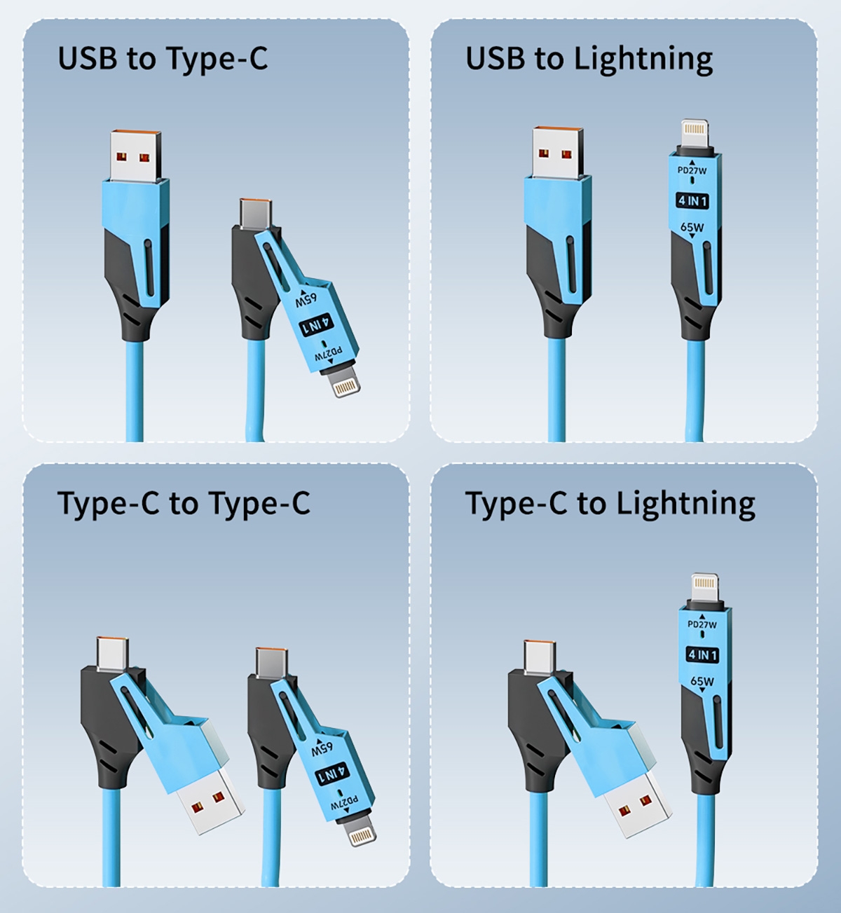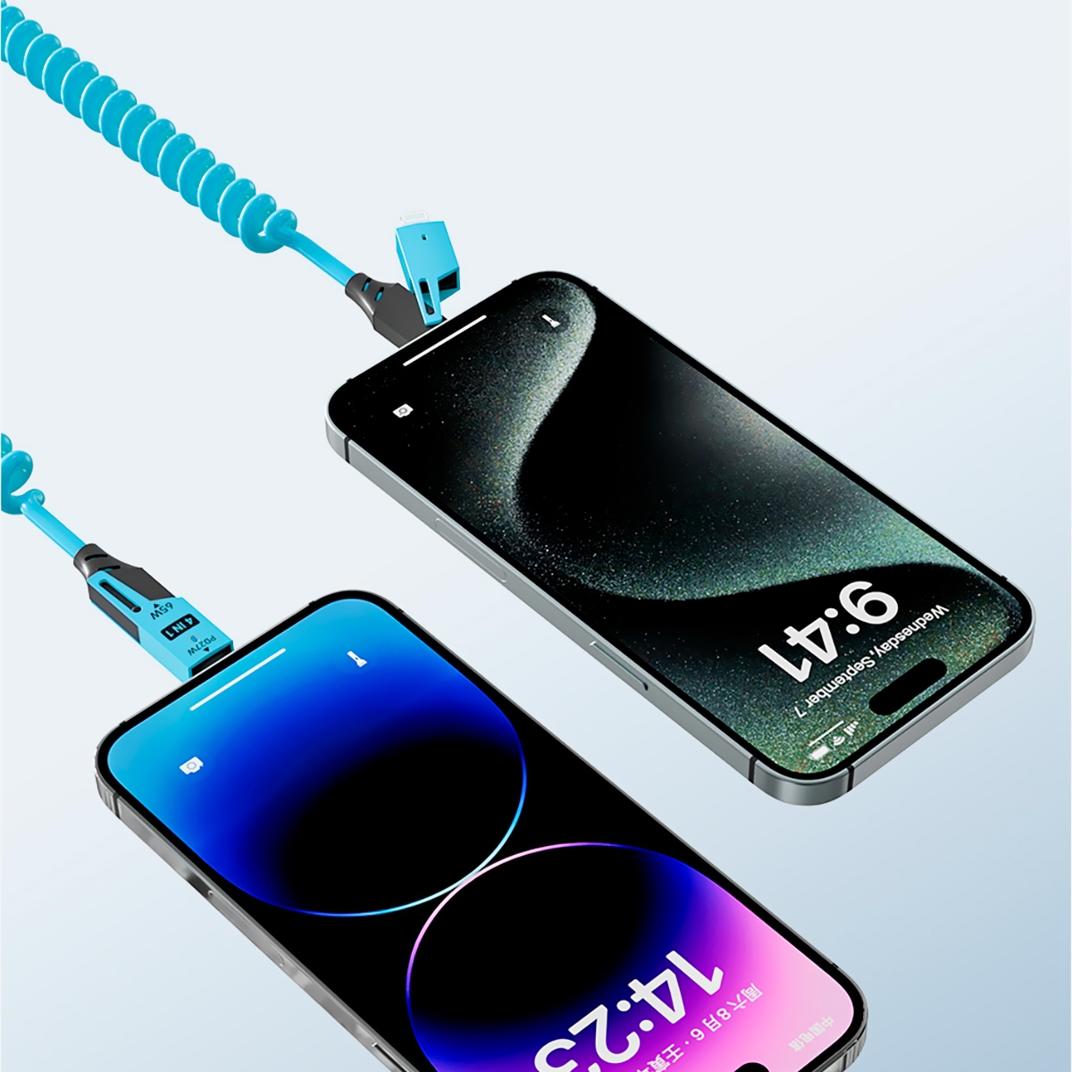 Spring-Loaded Design: This tangle-free and portable 4-in-1 car charging cable features a retractable spring mechanism that stretches from 1ft to 4ft and snaps back automatically. It combines four essential charging modes in one: USB A to USB C, USB A to Lightning, USB C to Lightning, and USB C to USB C—ensuring universal compatibility without the need for multiple cables.