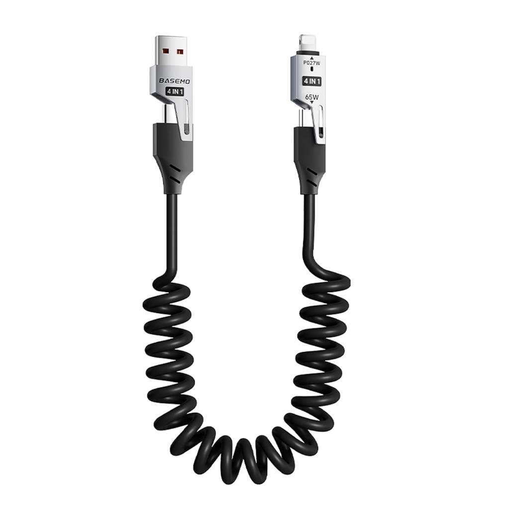 Spring-Loaded Design: This tangle-free and portable 4-in-1 car charging cable features a retractable spring mechanism that stretches from 1ft to 3ft and snaps back automatically. It combines four essential charging modes in one: USB A to USB C, USB A to Lightning, USB C to Lightning, and USB C to USB C—ensuring universal compatibility without the need for multiple cables.