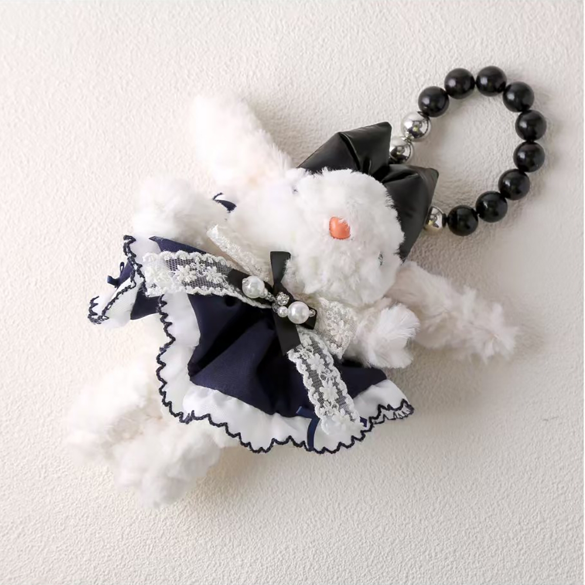 Elegant Navy Plush Bunny Keychain - Cute Lace & Pearl Accessory