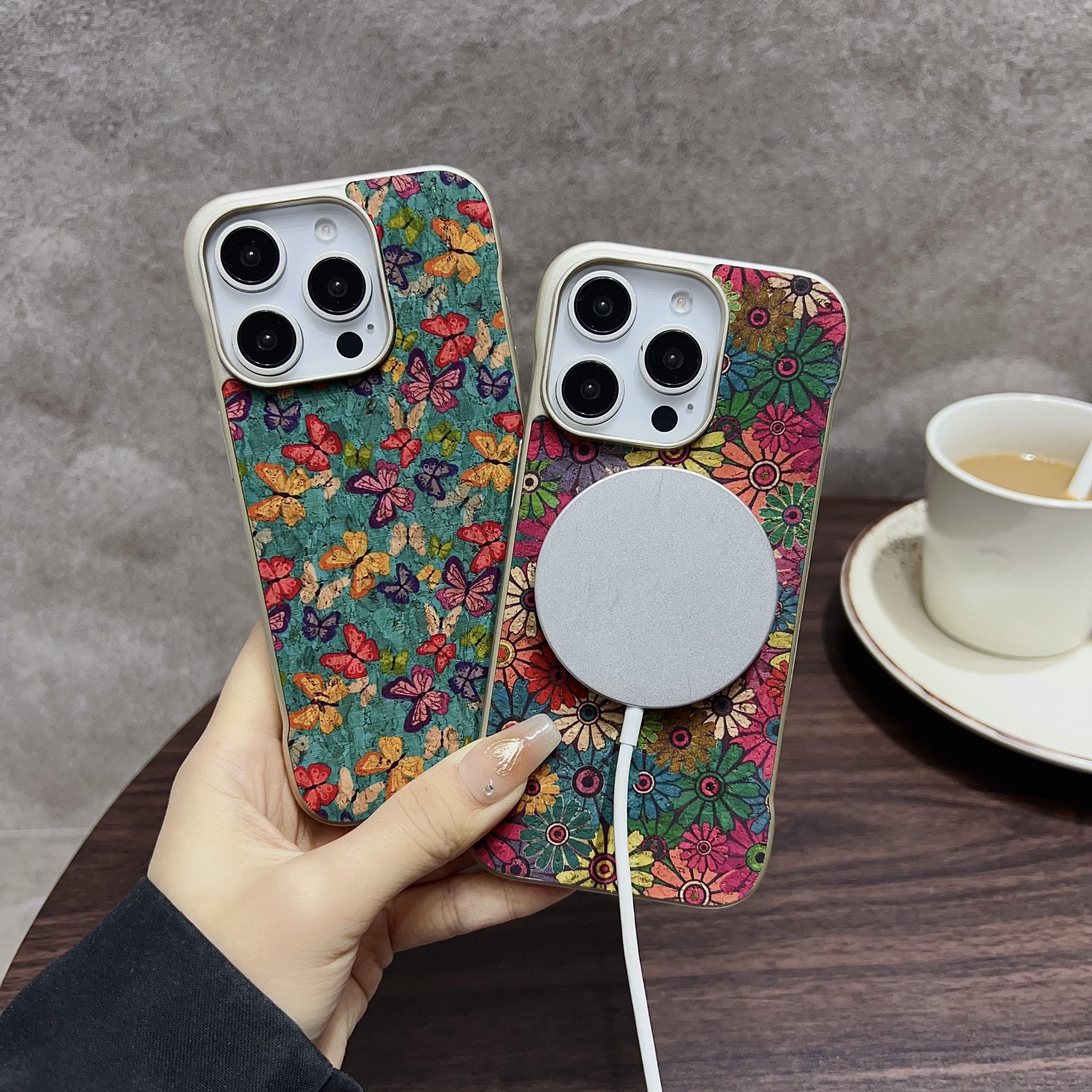 Denior Floral Pattern Frameless Phone Case for iPhone 16 Pro Max | Built-in N52 Magnet & MagSafe Wireless Charging Compatible | Eco-friendly Cork Material | Light Gold Painted Case - Butterfly Blue