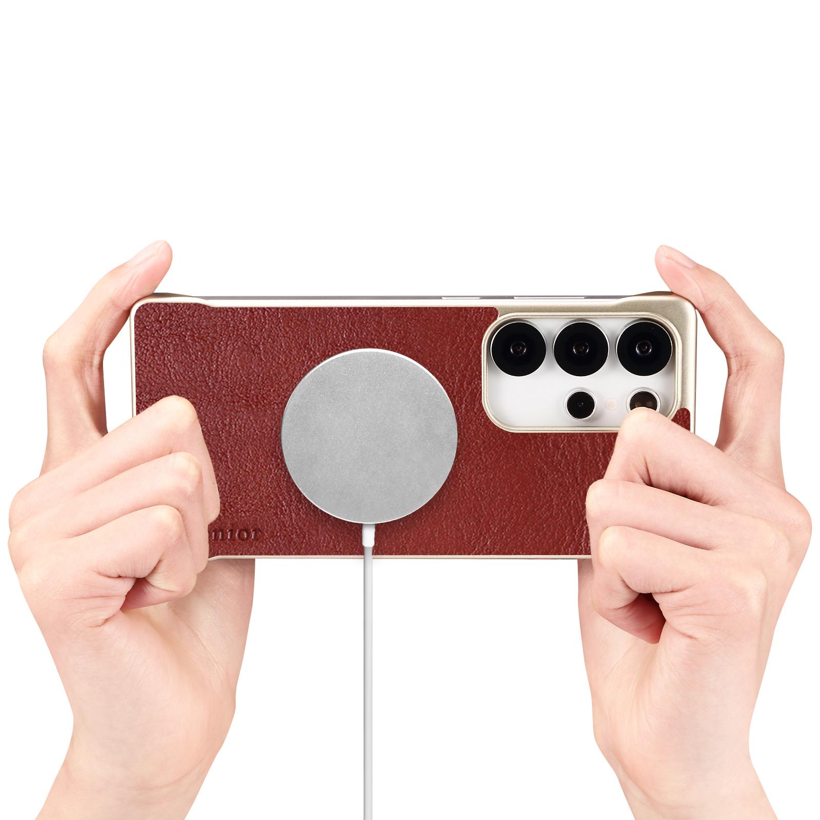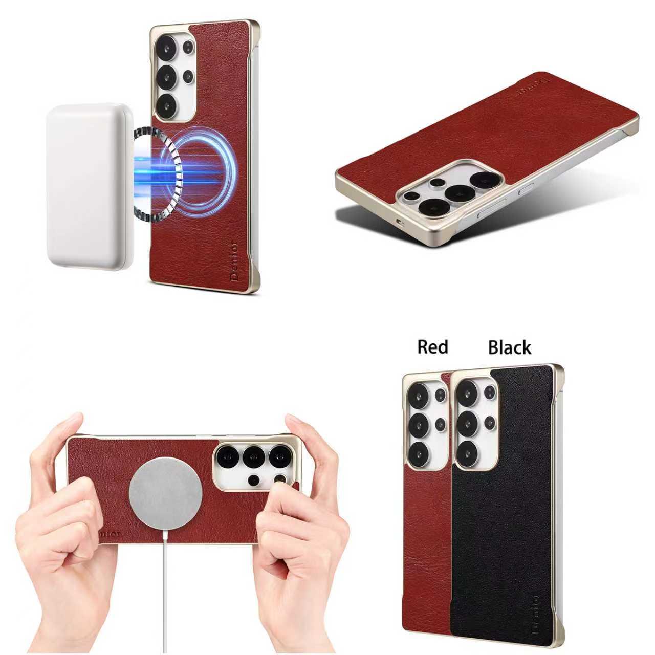 Denior Calf Pattern Genuine Cowhide Leather Frameless Phone Case for Samsung Galaxy S25 Ultra | Built-in N52 Magnet & MagSafe Wireless Charging Compatible | Genuine Cowhide Leather | Light Gold Painted Case - Red