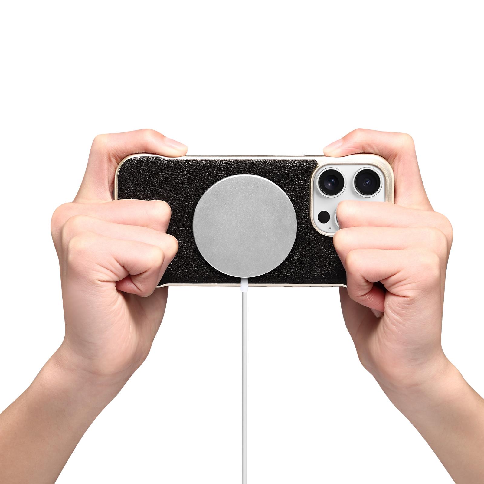 Denior Calf Pattern Genuine Cowhide Leather Frameless Phone Case for iPhone 16 Pro Max | Built-in N52 Magnet & MagSafe Wireless Charging Compatible | Genuine Cowhide Leather | Light Gold Painted Case - Black