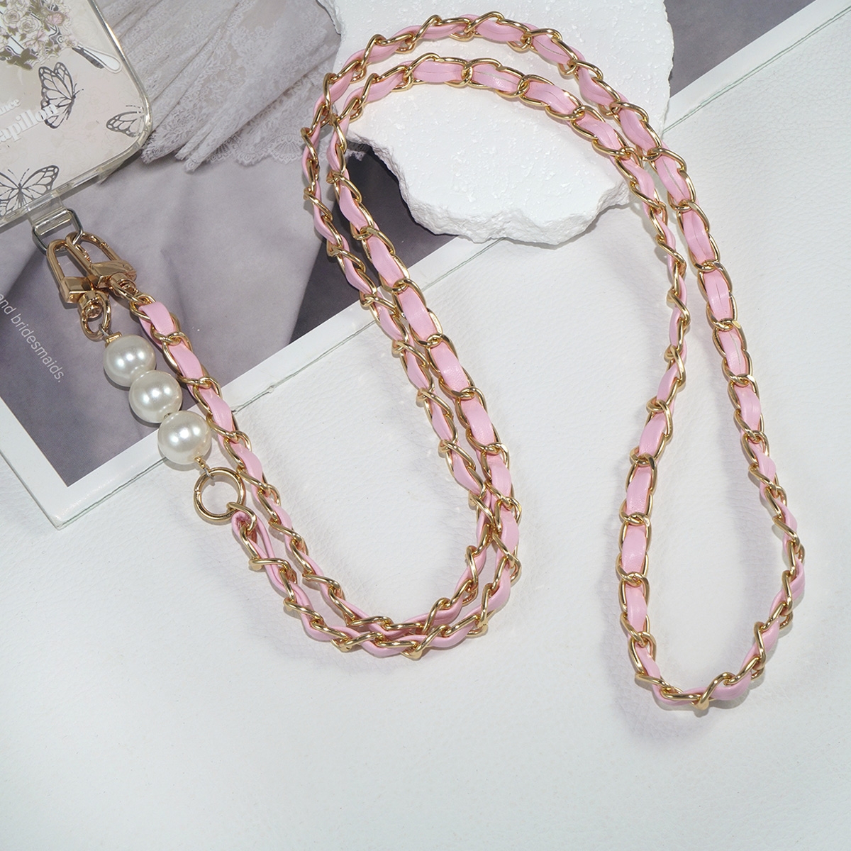 Chic Vegan Leather Woven Chain and Faux Pearl Crossbody Phone Lanyard, Pink