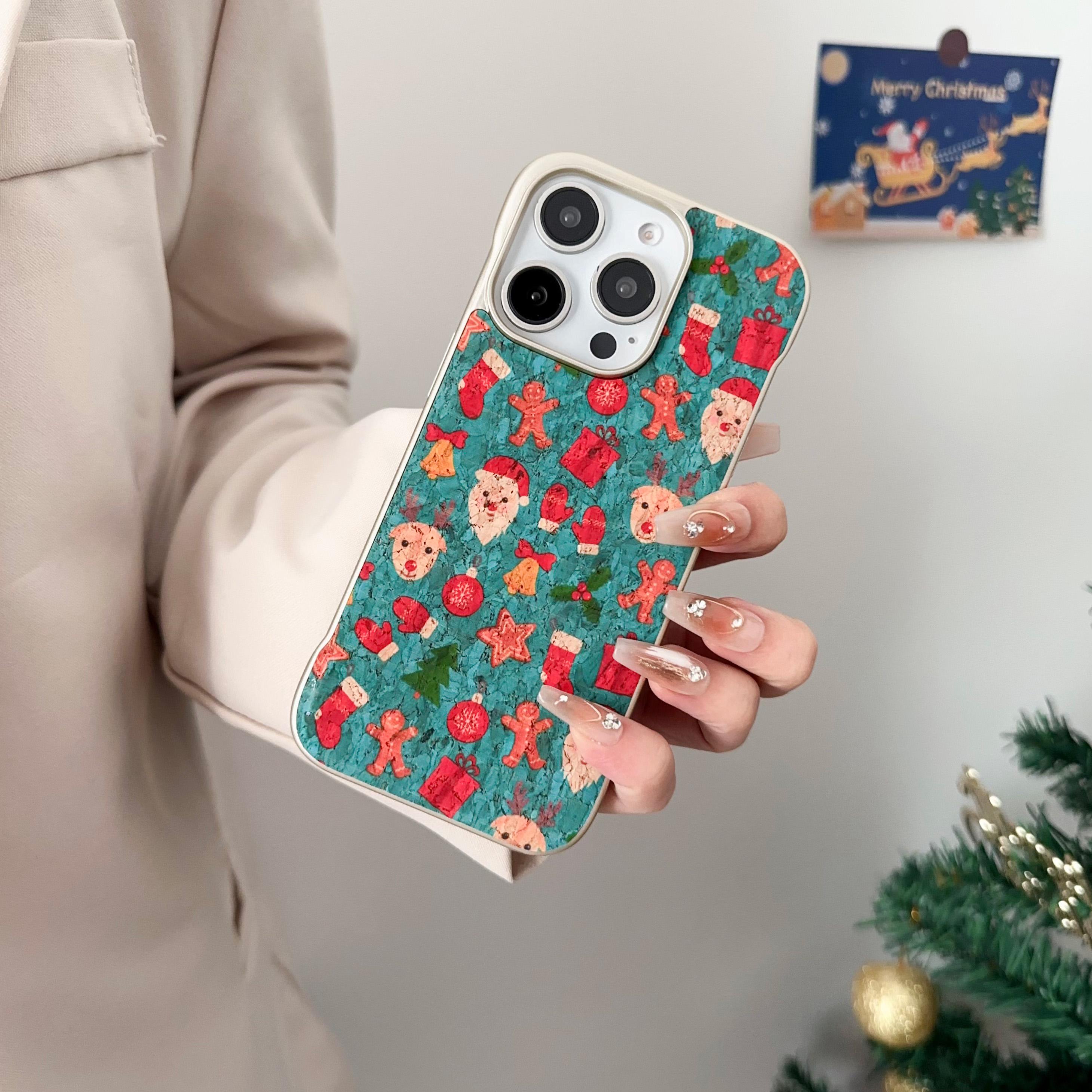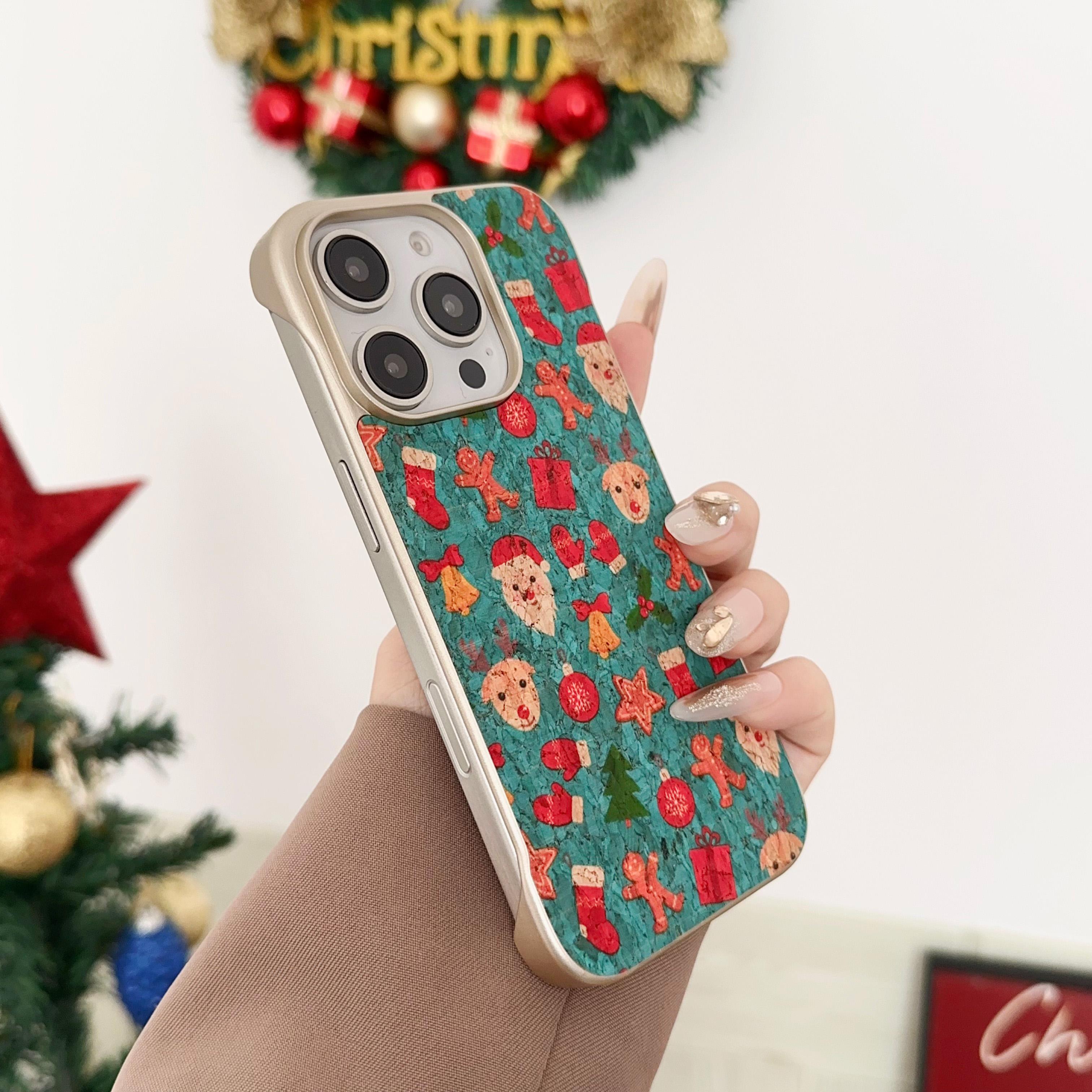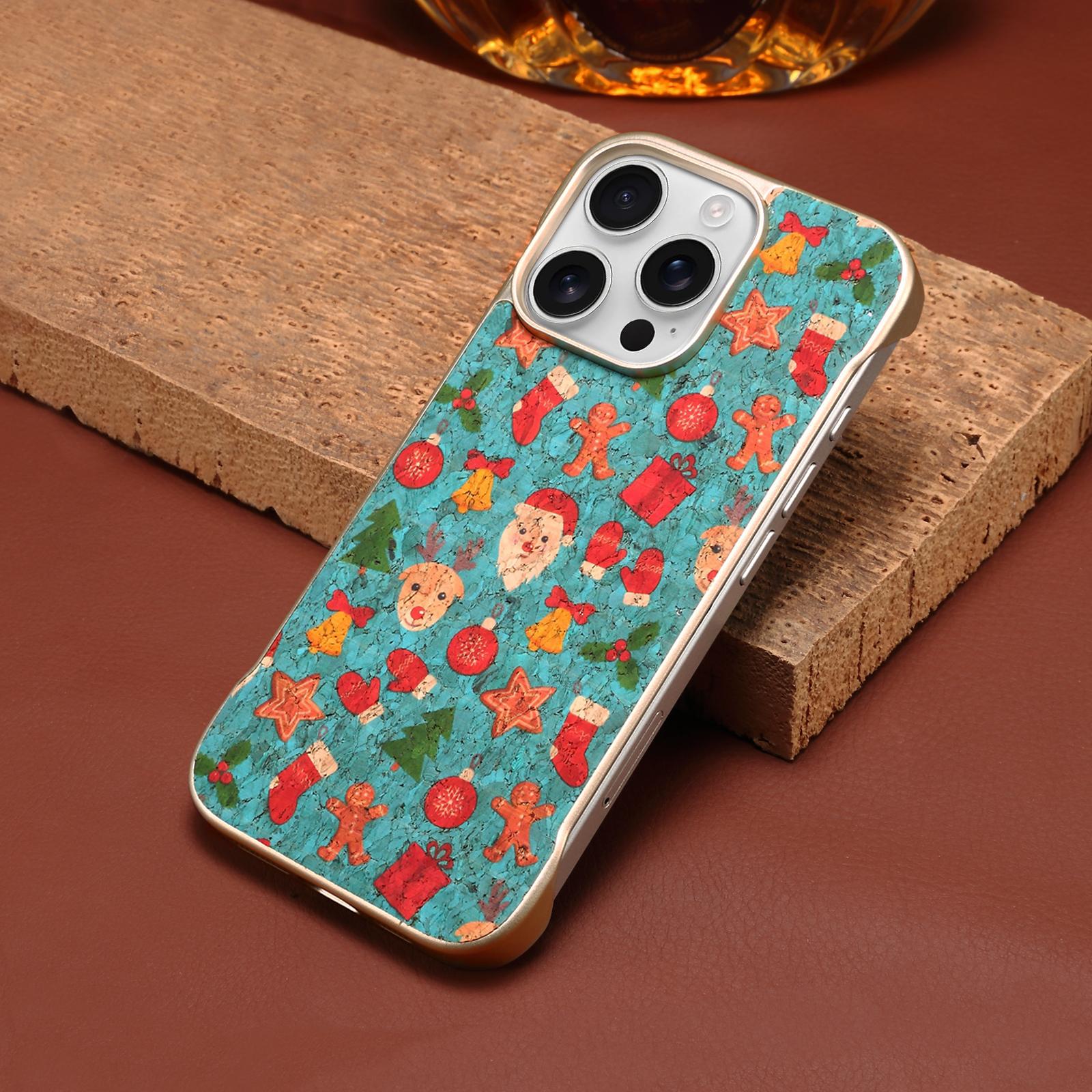 Denior Floral Pattern Frameless Phone Case for iPhone 16 Pro | Built-in N52 Magnet & MagSafe Wireless Charging Compatible | Eco-friendly Cork Material | Light Gold Painted Case - Christmas Blue