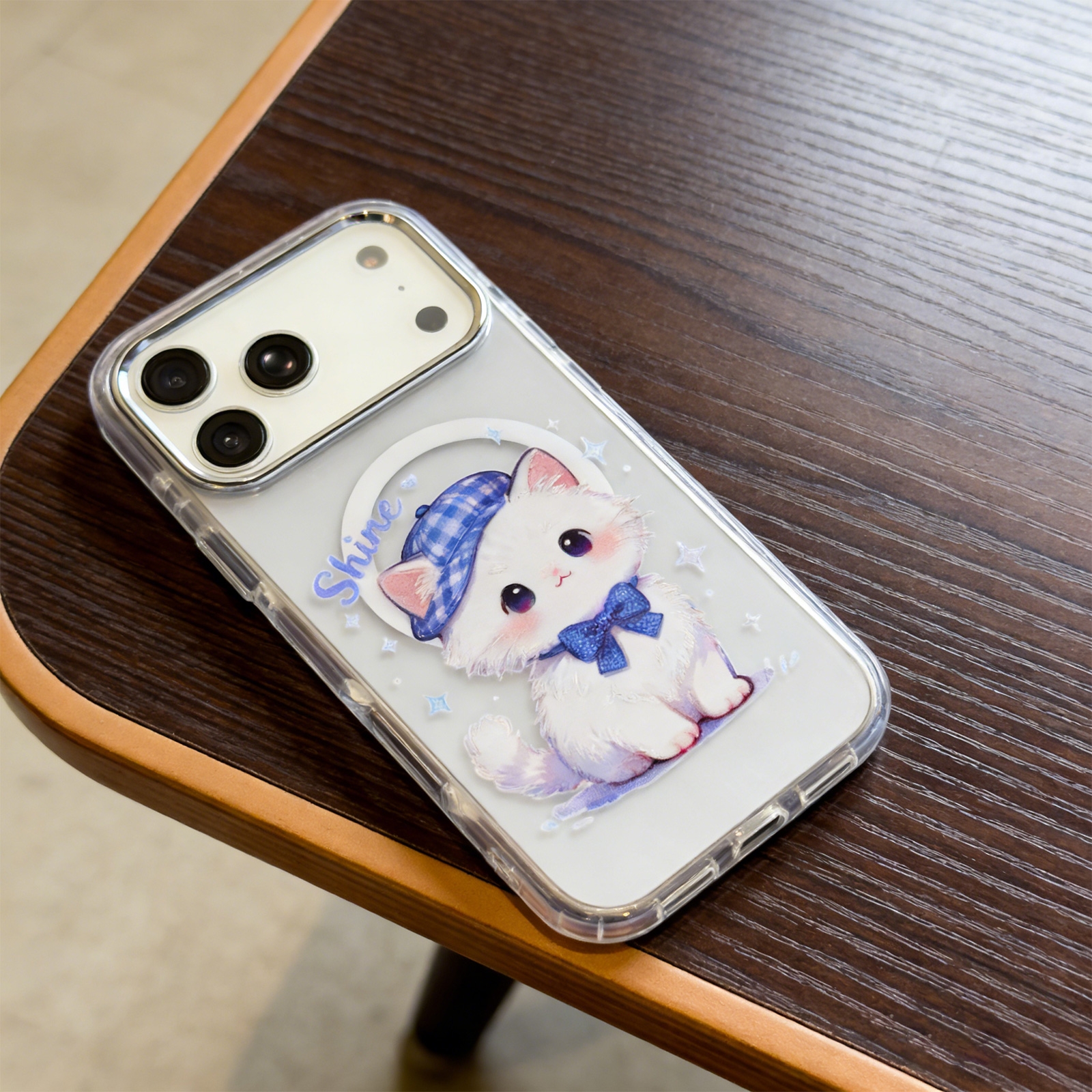 Clear Magnetic Phone Case for iPhone 17 Pro - Cute White Cat with Blue Plaid Hat Design