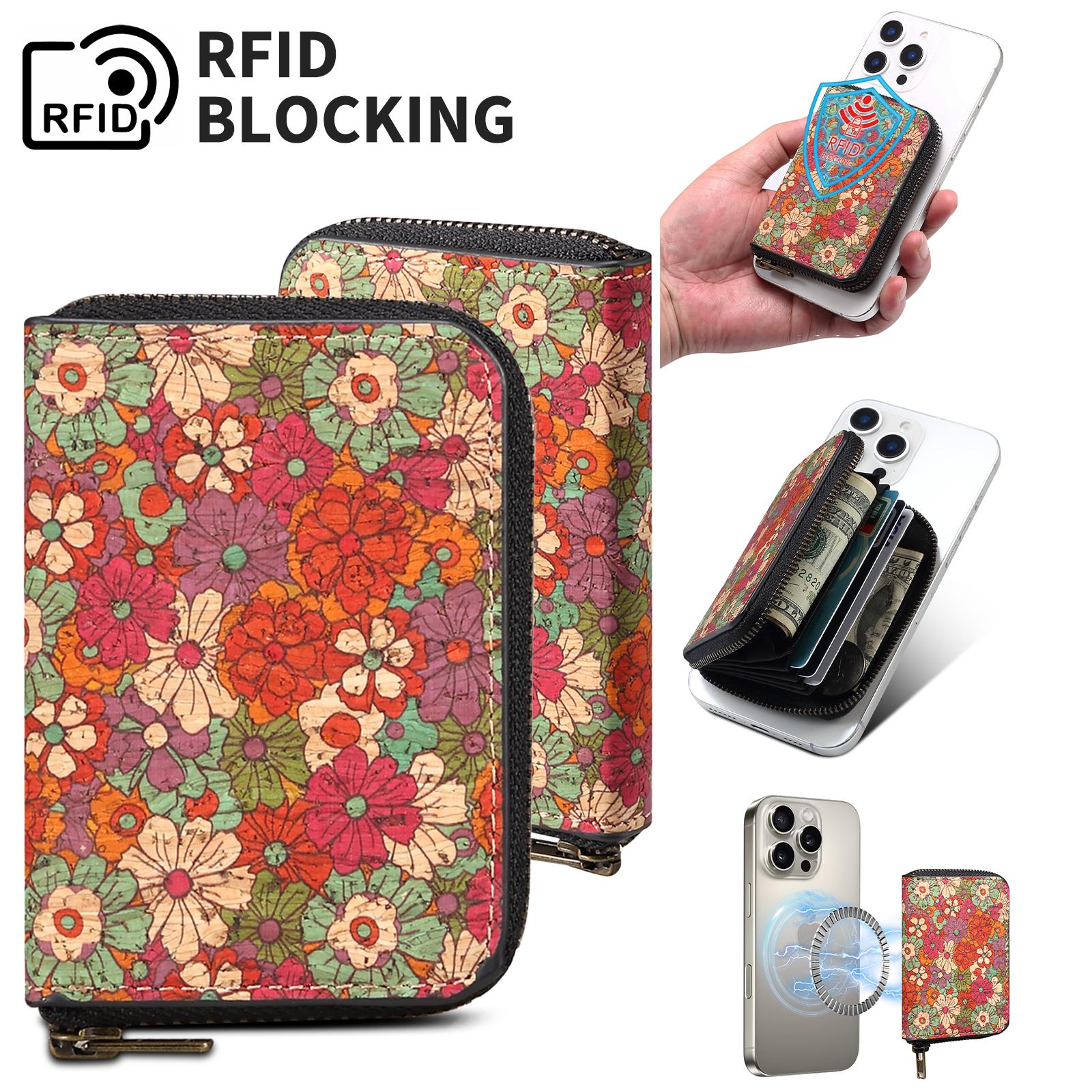 Cork Floral Printed N52 Magnetic RFID Blocking Zipper Card Holder, Red